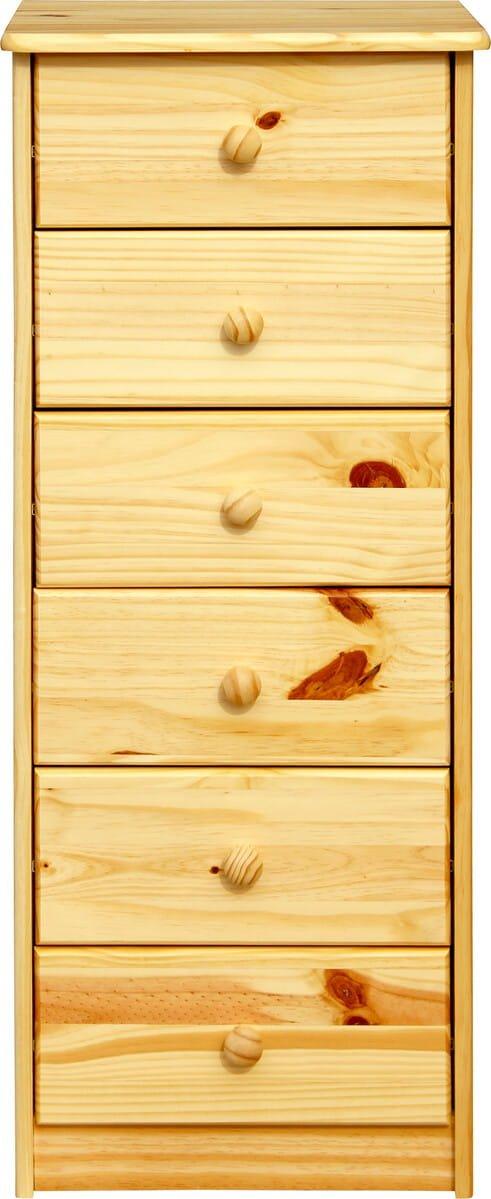 Diese solide und hochwertige Kommode ist aus massivem Kiefernholz gefertigt und die Oberflächen sind zum Schutz lackiert. Viel Stauraum und Platz für Wäsche befindet sich in 6 Schubladen mit Metallauszug. Ein sehr funktionales Möbelstück, das nicht nur pflegeleicht, sondern auch vielseitig verwendbar ist ideal zum Beispiel für ein Studentenzimmer oder kleine Räume.zeitloses Designpflegeleichte Oberflächevielseitig verwendbarsechs Schubladen mit Metallauszügenviel Stauraum