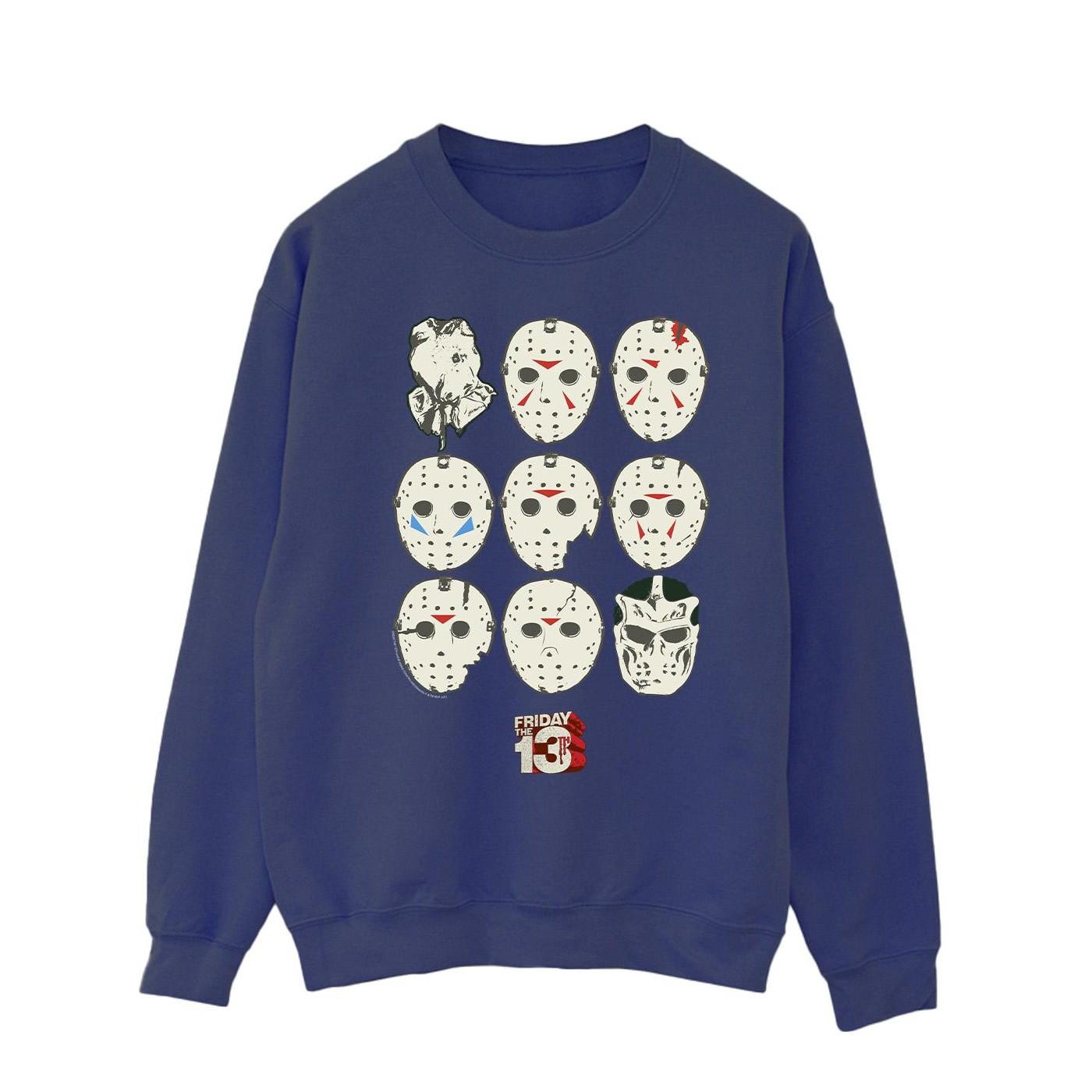 Dieses Sweatshirt zeigt einen grafischen Druck verschiedener Jason Voorhees Masken aus der Filmreihe Friday the 13th. Das Design präsentiert die Entwicklung der ikonischen Maske des Horrorcharakters und macht es zu einem unverwechselbaren Stück für Fans.