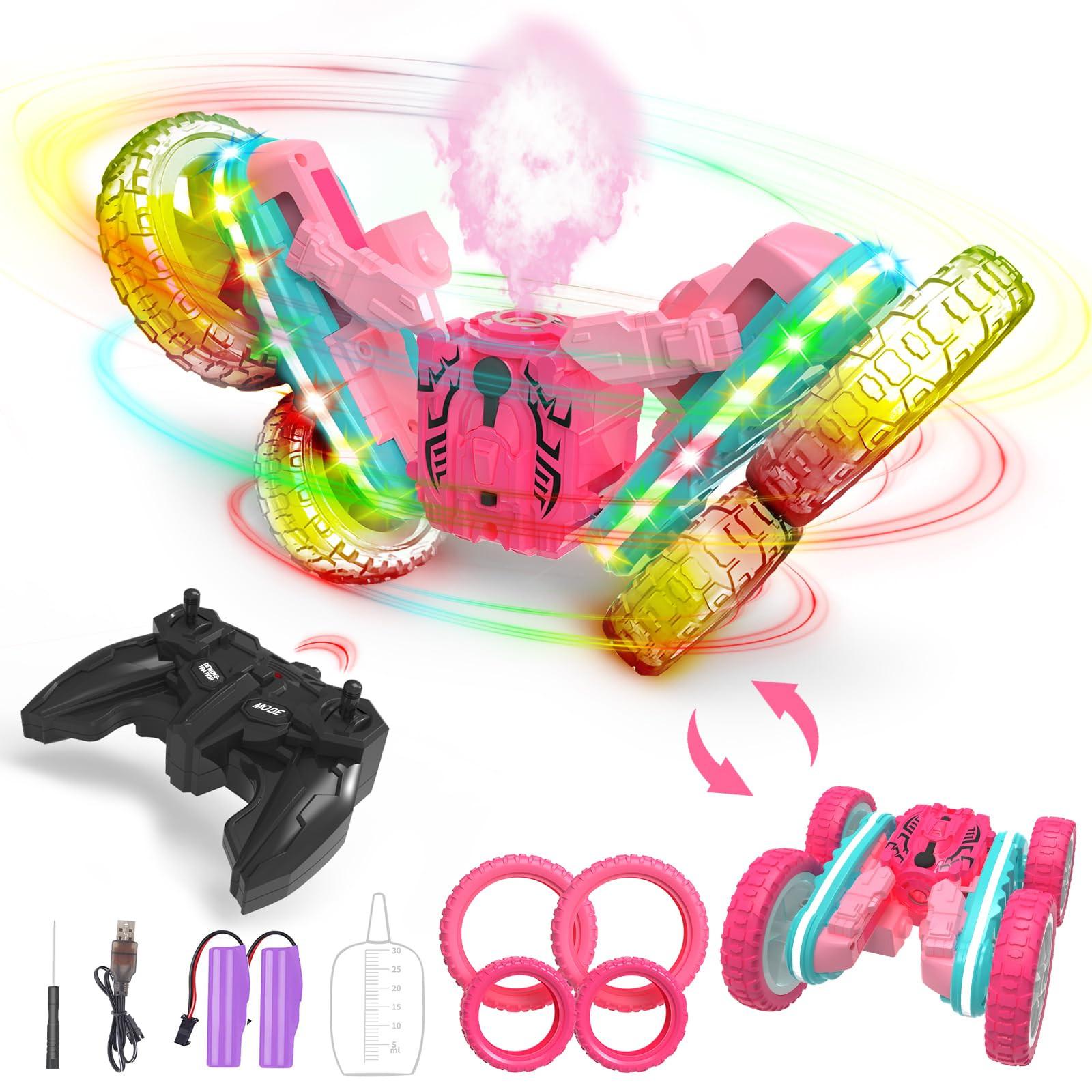 Kreatives RC-Auto für Mädchen: 360-Grad-Drehung auf beiden Seiten, Rennen zum Driften und Drehen des ferngesteuerten Autos. Dieses ferngesteuerte Stuntauto für Kinder dreht sich wie ein verrückter Zyklon mit coolen Lichteffekten und macht dich zum Mittelpunkt der Menge! 360 ° drehbares ferngesteuertes Stuntauto: Die doppelseitigen ferngesteuerten Autos können fahren, vorwärts, rückwärts fahren, rechts und links abbiegen, um 360 Grad rollen und auf beiden Seiten drehen und wenden. Sie können dieses elektrisch ferngesteuerte Stuntauto mit seiner Fernbedienung in jede Richtung steuern, um Kindern endlosen Spaß zu bereiten. Hochwertiges Design: Dieses Autospielzeug aus ABS-Material hat Stoßdämpfung, Rutschfestigkeit und Kollisionsschutz. Darüber hinaus sind diese ferngesteuerten Autos mit weichen, elastischen Gummireifen ausgestattet und können problemlos über Land, Schotterstraßen, Strände und Gras fahren.