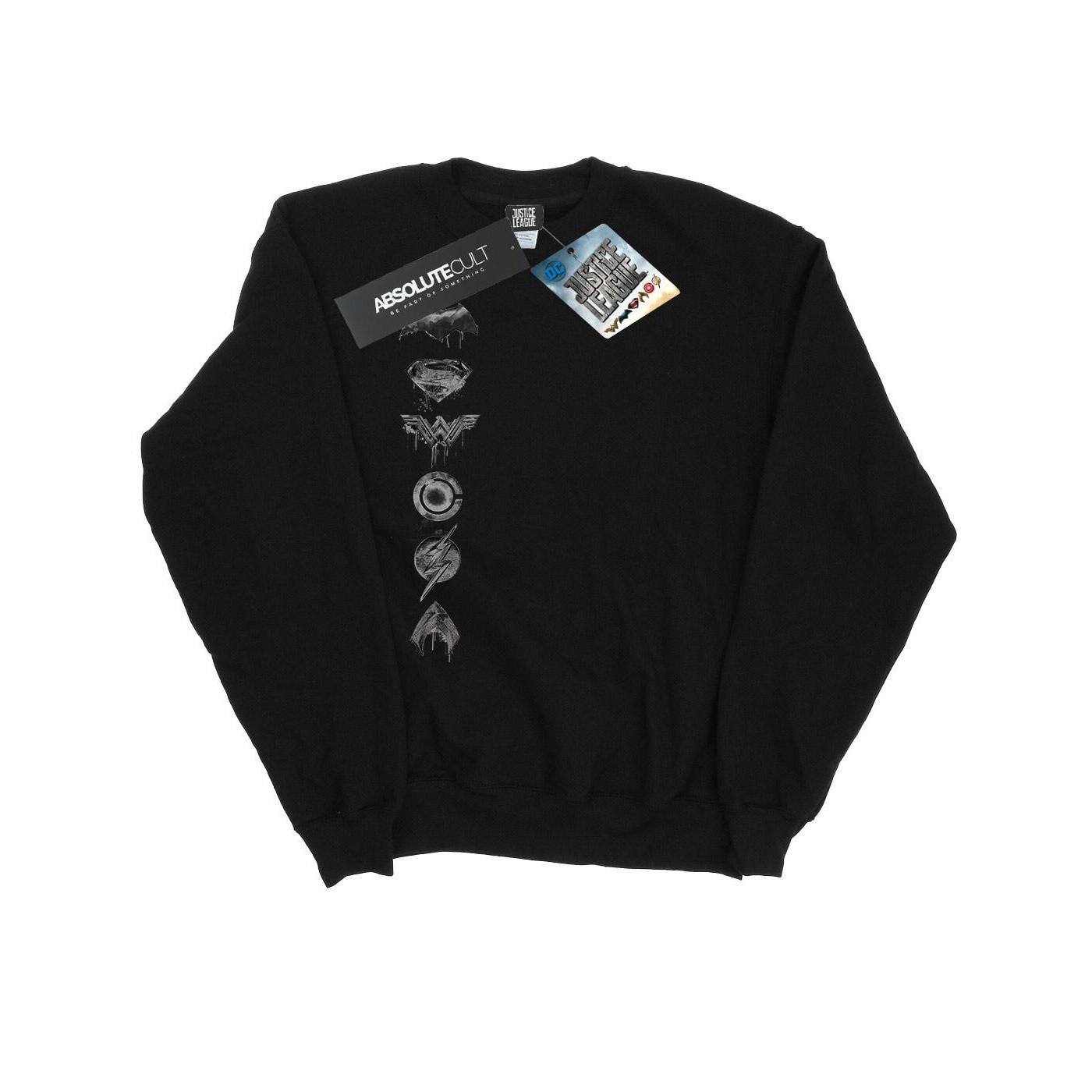 Dieses Justice League Sweatshirt präsentiert sich mit einem klassischen Rundhalsausschnitt und langen Ärmeln. Die Vorderseite des Sweatshirts zeigt eine vertikale Anordnung ikonischer Superhelden-Logos, darunter Batman, Superman, Wonder Woman, The Flash, Aquaman und Cyborg, in einem Used-Look mit Metallic-Effekt.