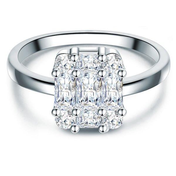 Sie sind auf der Suche nach einem besonderen Verlobungsring? Bei diesem Ring des Labels Trilani ist Ihnen ein begeistertes "Ja" Ihrer Liebsten sicher! Das funkelnde eckige Ensemble ist raffiniert zusammengesetzt aus unterschiedlich großen Zirkonia-Kristallen in Smaragd- und Brillantschliff - ein Blickfang auf der bewusst minimalistisch-schmalen Ringschiene. Eine Rhodinierung schützt Ringschiene und Fassungen aus hochglanzpoliertem 925er Silber vor dem Anlaufen. Ein stilvolles Accessoire, das den angesagten Geolook glamourös interpretiert und auch nach der Hochzeit garantiert gern getragen wird!