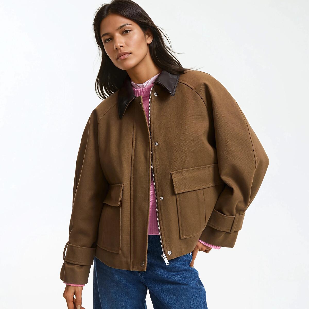 Diese kurze Jacke mit trapezförmigem Volumen bietet einen bequemen und stilvollen Oversize-Schnitt. Mit ihrem Kragen aus Kunstleder, den grossen Pattentaschen mit Balg und den Abnähern an den Ärmelabschlüssen steht diese lockere Baumwolljacke für einen authentischen Freizeitstil.