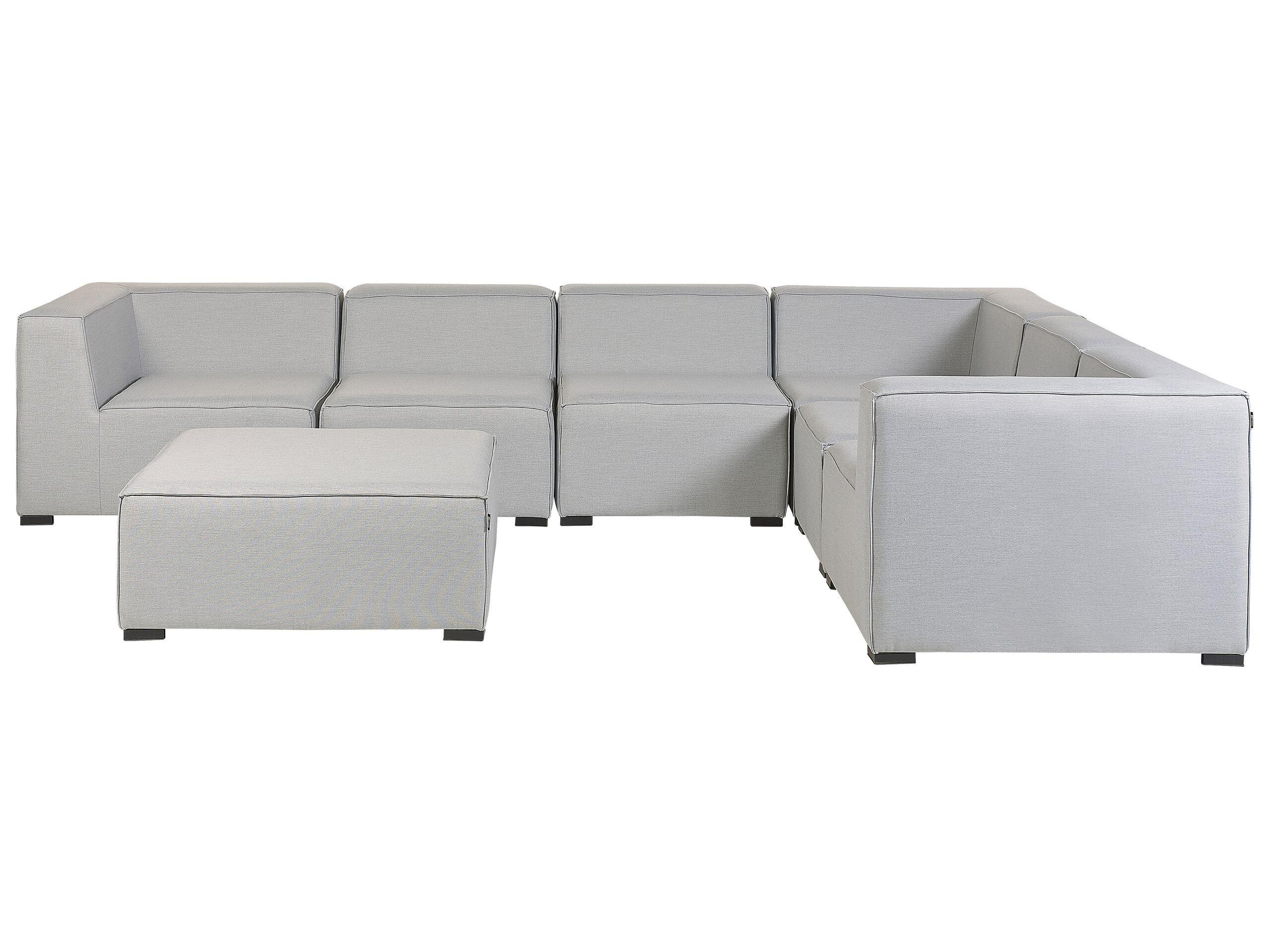 Luxuriöses 6-teiliges Outdoor und Indoor Modul-Ecksofa mit passender Ottomane. Dieses vielseitig aufstellbare Set besteht aus 3 Ecksofas, 3 Mittelteilen ohne Armlehnen und einem quadratischen Hocker. Sie können alle Sitzelemente jedoch auch alle als alleinstehende Elemente platzieren und so die Aufstellung flexibel, individuell und ganz nach Bedarf an Ihre räumlichen Gegebenheiten anpassen. Das stabile, schwarze Untergetell ist aus pulverbeschichtetem Metall gefertigt. Die Gartenmöbel sind im Inneren mit einem schnelltrocknenden Schaumstoff gepolstert, welcher Wasser dank seiner speziellen Struktur wesentlich schneller durchlaufen lässt als hochelastische Schaumstoffe.