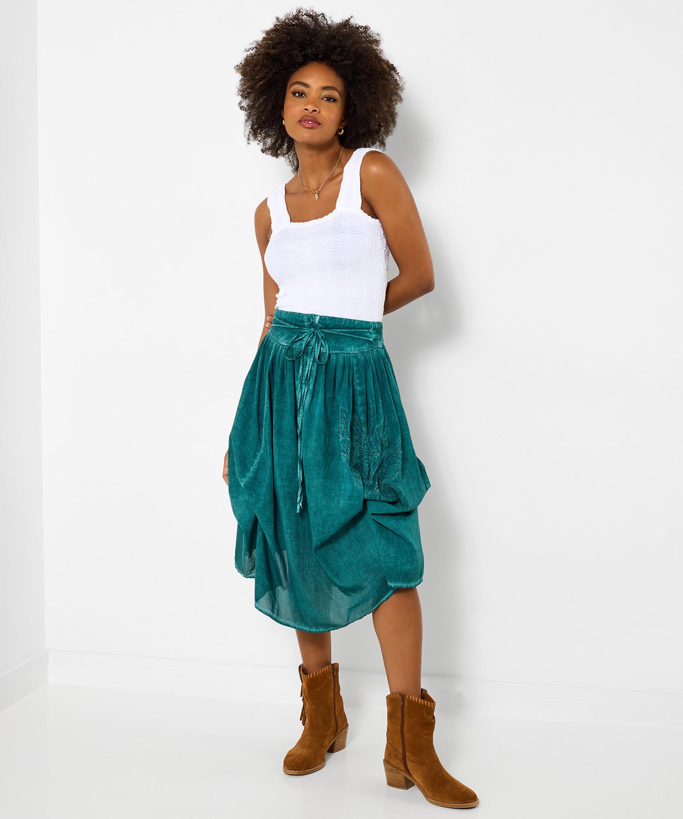Die verstellbare Ausführung und die Stickerei machen diesen Rock besonders vielseitig einsetzbar.