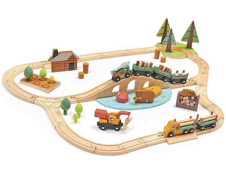 Das Set enthält 30 Schienen, eine Lokomotive und 3 Waggons, mit denen Kinder spannende Wege durch die Wildnis erkunden können. Ein Ladefahrzeug mit magnetisiertem Kran belädt einen Holzlastwagen mit 9 magnetisierten Baumstämmen und entfernt Tannenbäume von den Schienen. Zusätzlich gibt es Zubehör wie einen Holzstapel mit einem schlafenden Bär, einen See mit 2 magnetisierten Felsbrocken und eine Baumschule. Das Set besteht aus hochwertigem Holz und hat die Masse 94 x 63 x 16 cm.
