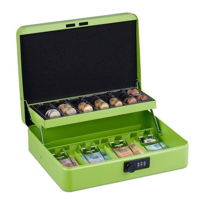 Wenn Sie Bargeld sicher aufbewahren möchten, ist diese Kassette zum Geldzählen die richtige Wahl. Die Registrierkasse eignet sich sowohl für den Einsatz zu Hause als auch auf Flohmärkten, Messen und anderen Veranstaltungen. Im herausnehmbaren Münzfach können Sie die Münzen nach Wert sortieren, sodass Sie stets den Überblick behalten. Die Sparkasse ist mit einer 3-stelligen Zahlenkombination gesichert und lässt sich am Tragegriff bequem transportieren.