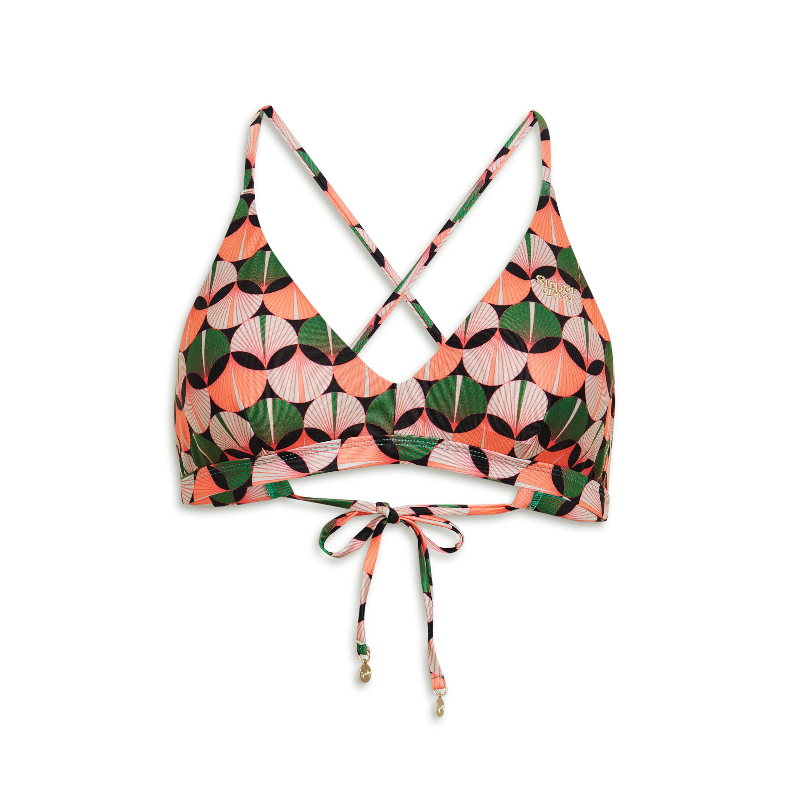Dieses Bikini-Oberteil mit lebhaftem geometrischem Muster sorgt für einen stilvollen Look am Strand oder Pool. Das Design umfasst gekreuzte Träger am Rücken für einen sicheren Halt und einen Bindebandverschluss vorne für verstellbaren Komfort. Es ist perfekt, um bei jeder Gelegenheit ein Statement zu setzen.