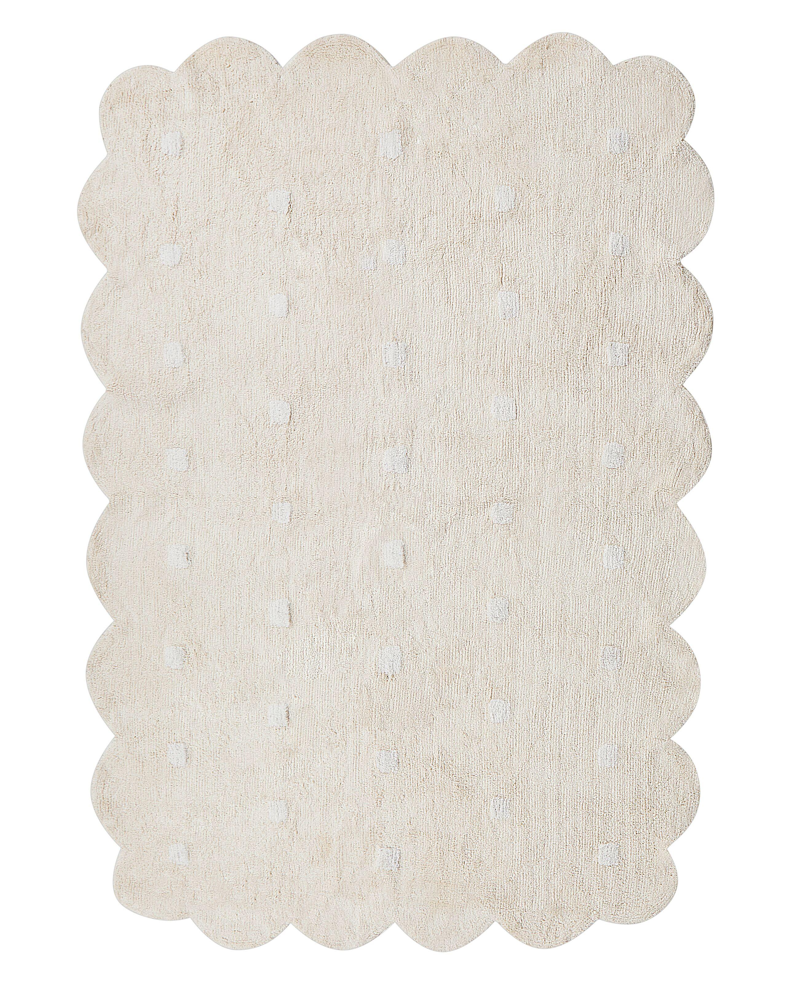 Keksförmiger Teppich. Dieser Teppich in Keksform ist aus weicher Baumwolle in einem neutralen Beigeton gefertigt und eignet sich hervorragend, um jedem Kinderzimmer einen fröhlichen Touch zu verleihen. Das süsse Tupfenmuster verleiht dem Teppich einen originellen Touch, während die plüschige Textur für ein weiches und kuscheliges Liegegefühl sorgt. Verschönern Sie das Zimmer Ihres Kindes mit dieser stilvollen und einladenden Ergänzung, die Komfort und Charme verspricht.