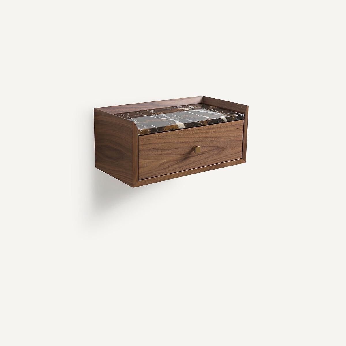 Hochwertige Verarbeitung und ein Mix aus edlen Materialien: Der Nachttisch Noham aus Nussbaum und bernsteinfarben gemasertem Marmor weist tolle Details auf: abgeschrägte Kanten, Schublade mit Soft-Closing-Mechanismus und einen Griff aus mattem Metall.