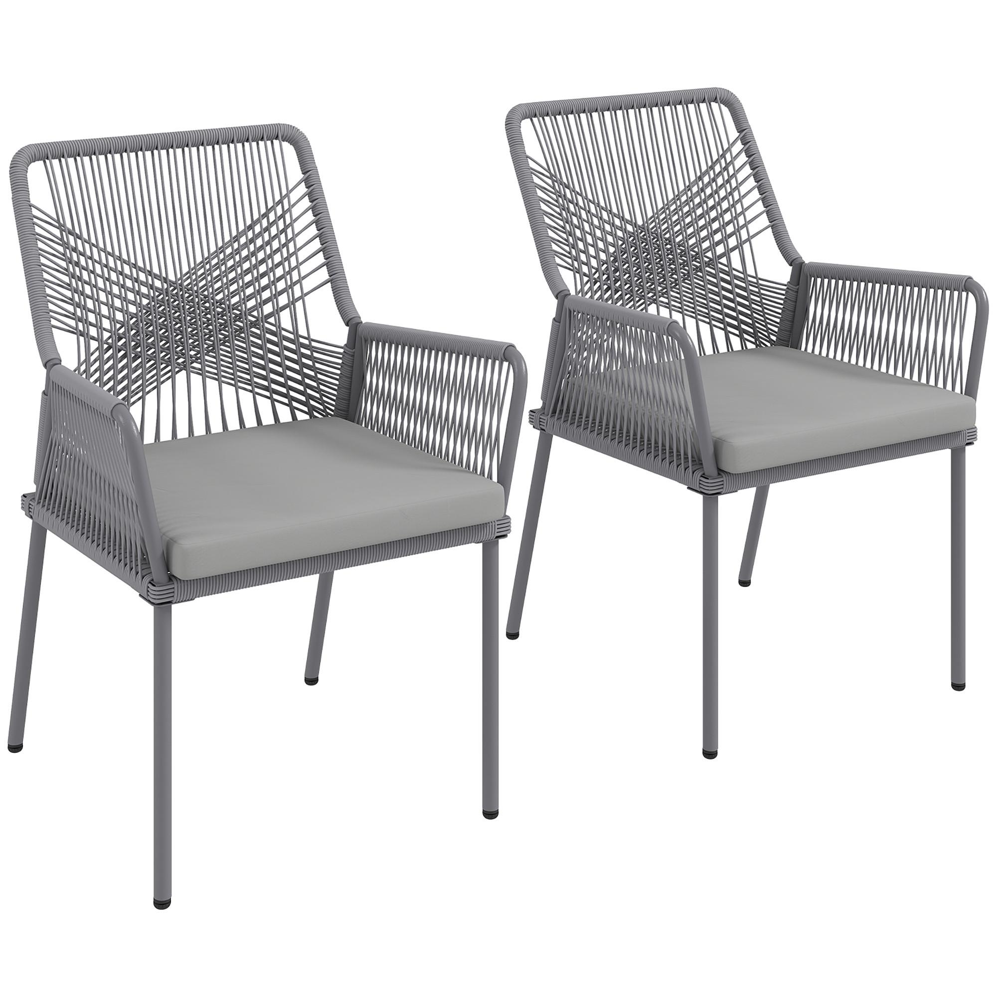 Verschönern Sie Ihre Außenbereiche mit unseren charmanten Outsunny Rattan-Stühlen, perfekt für Garten, Balkon oder Terrasse. Genießen Sie den Komfort stilvoller, 5 cm dicker Kissen und großzügiger Rücken- und Armlehnen des Gartenstuhls. Aus UV-beständigem Rattan und einem pulverbeschichteten Stahlrahmen gefertigt, garantieren diese Balkonstühle Langzeitbeständigkeit unter freiem Himmel. Die Kissen sind zudem abnehmbar und leicht zu reinigen.