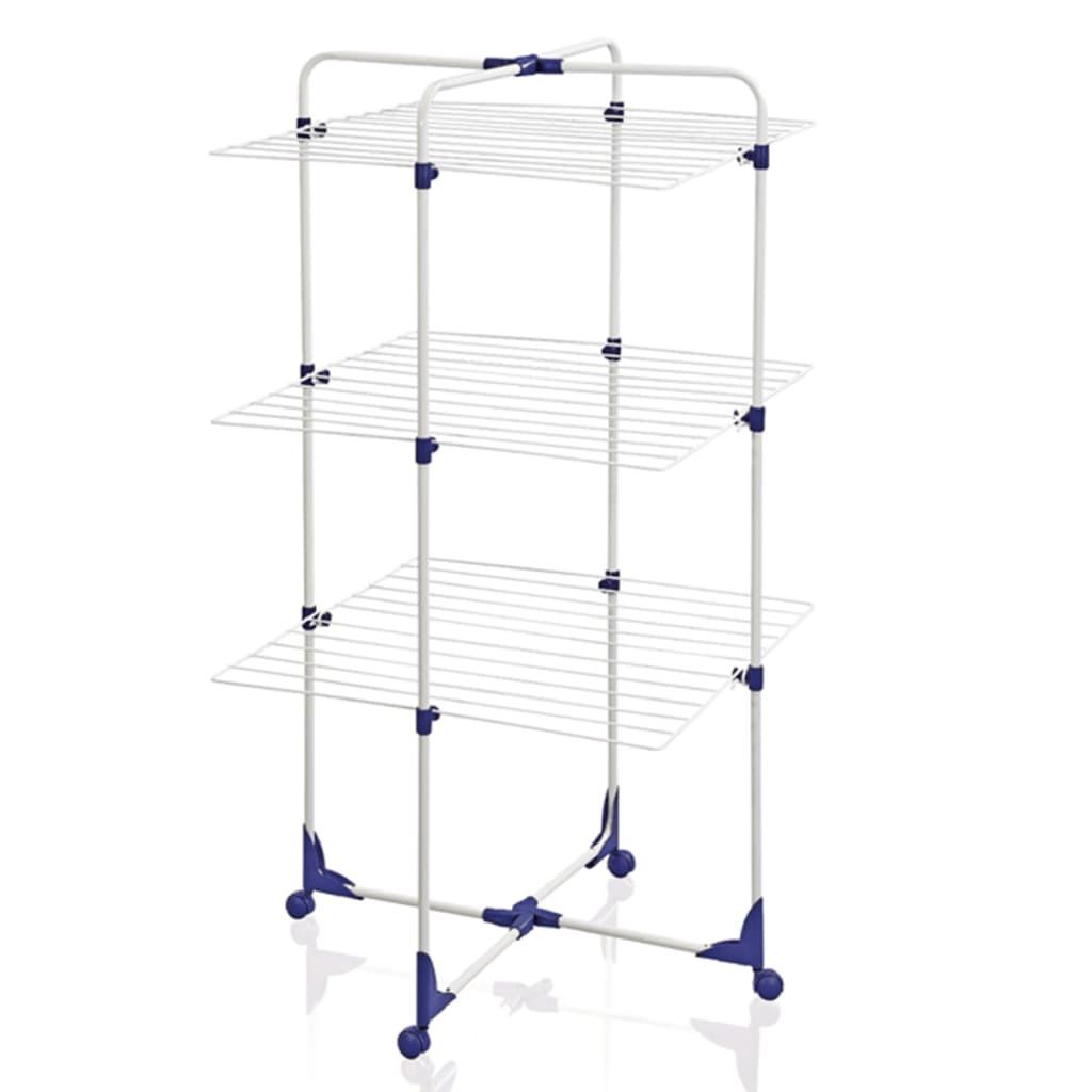 Drei übereinander liegende Trockenebenen bieten eine Trockenlänge von 27 Meter und Platz für 3 Waschmaschinenladungen. Dank seinem abklappbaren Rahmen ist der Turmtrockner halbseitig nutzbar.