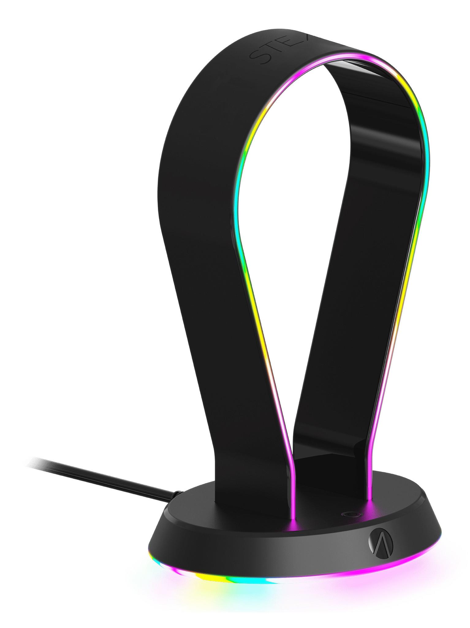 Der Stealth Gaming Headset Stand ist mit den meisten Gaming-Headset-Designs kompatibel und trägt dazu bei, die Form Ihres Headsets beizubehalten und Schäden zu verringern. Er verfügt über 12 RGB Beleuchtungseffekte für eine tolle Gaming Atmosphäre, sowie über zwei USB 2.0 Ports zum Versorgen und Aufladen und Geräten.FeaturesPassend für alle Headsetgrössen und -arten Ständer und Basis mit RGB-Beleuchtung 12 RGB-Beleuchtungseffekte 2 USB 2.0 Ports zum Versorgen und Aufladen und Geräten Beschwerte Basis Stromversorgung über USB (Kabellänge ca. 1,5 m)