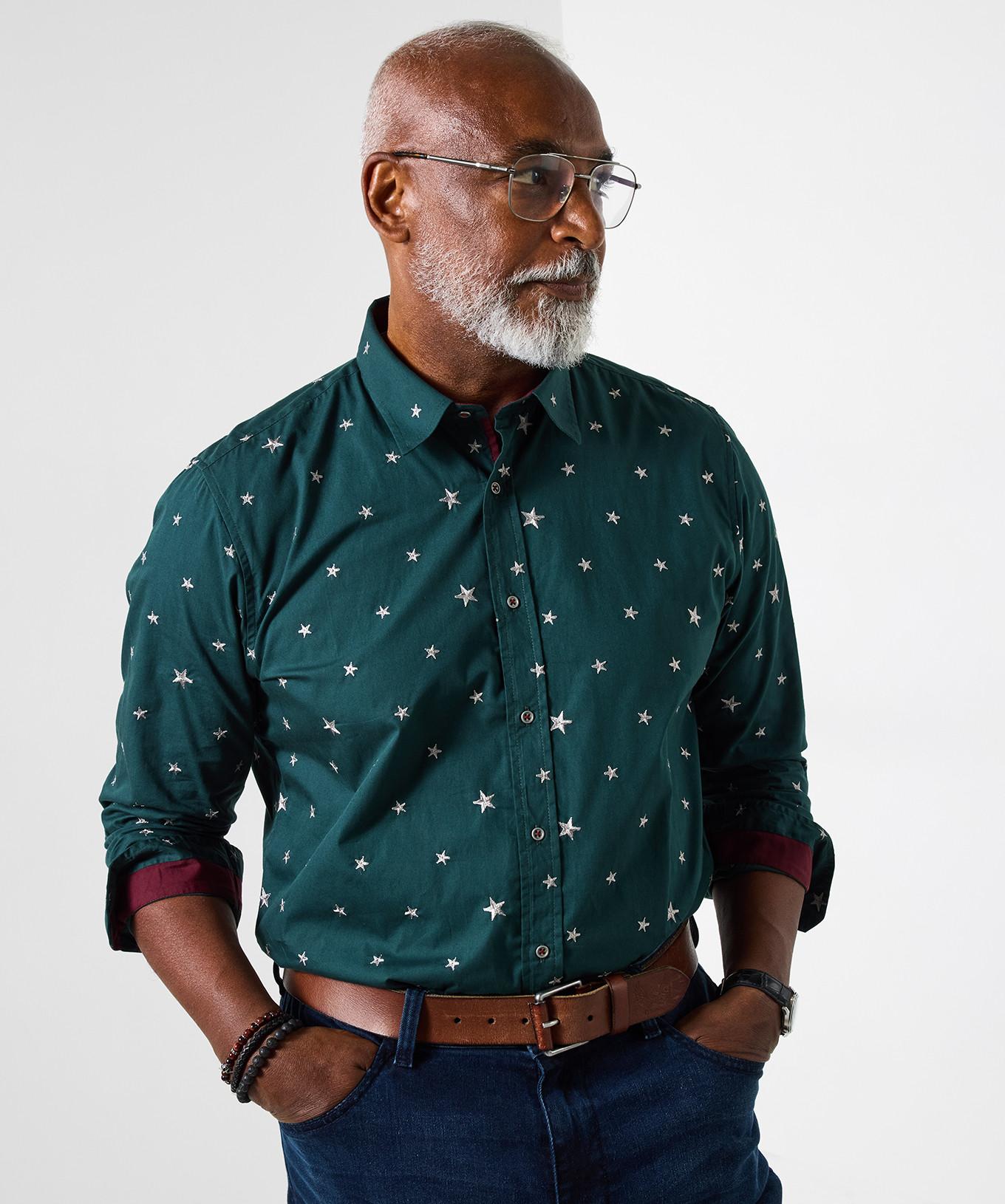 Dieses Hemd verfügt über eine verspielte Sternenstickerei, die einem klassischen Design eine unverwechselbare Note verleiht. Die langen Ärmel und die durchgehende Knopfleiste bieten einen vielseitigen Look, der für verschiedene Anlässe geeignet ist.