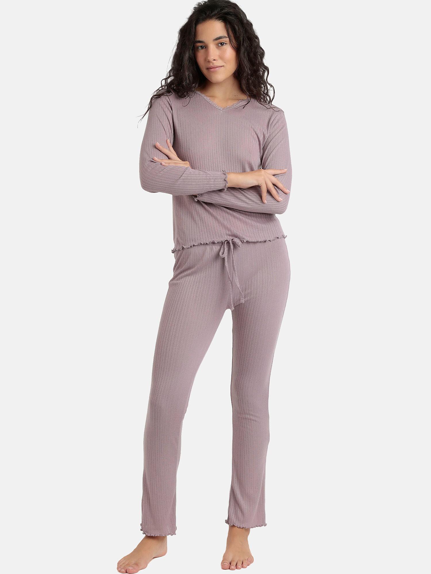 Dieses Pyjama-Set bietet Komfort und Stil für entspannte Stunden zu Hause. Das Nachtwäsche-Set besteht aus einem leichten Stoff aus halb Baumwolle, halb Viskose, der sehr bequem und weich auf der Haut ist. Es ist vollständig aus einem gerippten Pointelle-Strick gefertigt. Das langärmelige Oberteil ist mit Spitzendetails rund um den V-Ausschnitt verziert. Die gerade geschnittene Hose ist leicht und angenehm zu tragen. Feine romantische Wellen verleihen den Handgelenken, Knöcheln und dem unteren Teil des Outfits einen romantischen Touch.