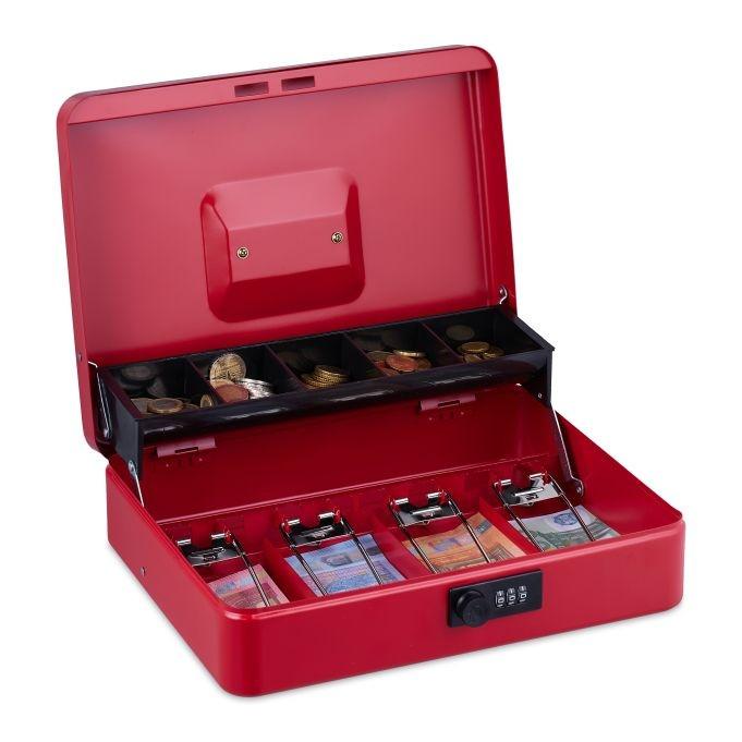 Kleine Geldkassette für Münzen und ScheineWenn Sie Bargeld sicher aufbewahren möchten, ist diese Geldkassette die richtige Wahl. Die Geldschublade eignet sich sowohl für den Einsatz zu Hause als auch auf Flohmärkten, Messen und anderen Veranstaltungen. Münzen können Sie in den 5 Münzfächern und Banknoten in den 4 Geldscheinfächern nach Wert sortieren, sodass Sie stets den Überblick behalten. Die Geldschublade ist mit einer 3-stelligen Zahlenkombination gesichert und lässt sich am Tragegriff bequem transportieren.