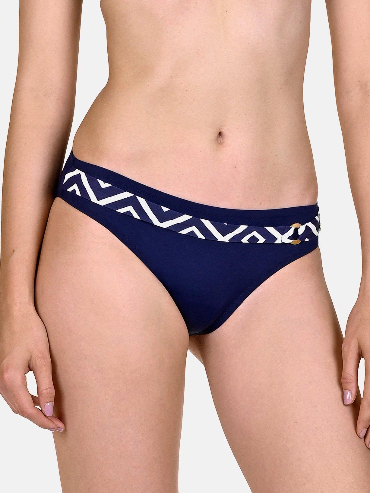 Die Costa Rica Bikinihose von Lisca betont die Weiblichkeit mit einem eleganten und raffinierten marineblauen Design. Ein dekorativer Gürtel mit modernem geometrischem Muster auf der Vorderseite hebt diese klassische Bikinihose hervor und bietet eine bequeme Passform. Ein dekoratives Metalldetail befindet sich ebenfalls am Bund. Die Höhe des Slips beträgt ca. 24 cm.