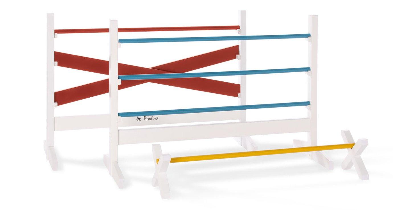 Eigenschaften: Zertifikat, Zertifikate: FSC, Altersempfehlung ab: 3 Jahren3-teilig: 2 Steilsprünge, 1 CavalettiFSC-zertifiziertMit den farbenfrohen Hindernishürden können tolle Reitturniere und Wetthüpfen veranstaltet werdenSteilsprünge: B 89 cm, T 34 cm, H 62 cm / Cavaletti: B 89 cm, T 16 cm, H 16 cmAltersempfehlung ab 3 JahrenVollmassiv: Tanne, weiss und bunt lackiert