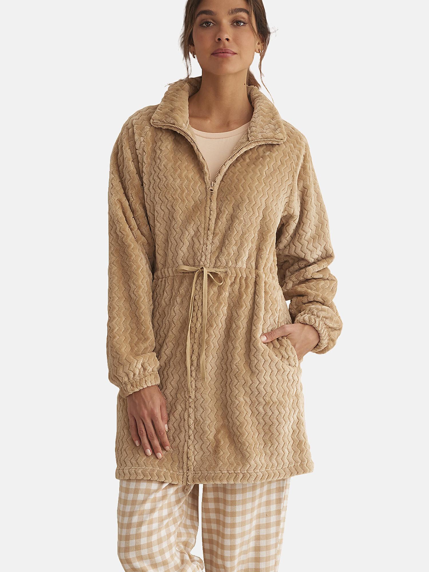 Diese Hausjacke aus der SUPERSOFT COMPLEMENTOS Kollektion ist aus einem ultraweichen und angenehm zu tragenden Stoff gefertigt. Sie weist ein strukturiertes Gewebe mit feinen vertikalen Wellen auf, die ihr einen originellen Stil verleihen. Die Jacke hat lange Ärmel mit elastischen Manschetten, einen Stehkragen und Seitentaschen. Sie wird vorne mit einem Reissverschluss geschlossen und ist in der Taille mit einem Band verstellbar, das eine betonte Silhouette ermöglicht. Diese Jacke sorgt für perfekte Cocooning-Abende, hält warm und bietet Komfort und Wohlbefinden. Sie kann auch im Freien für abendliche und Wochenendausflüge getragen werden.
