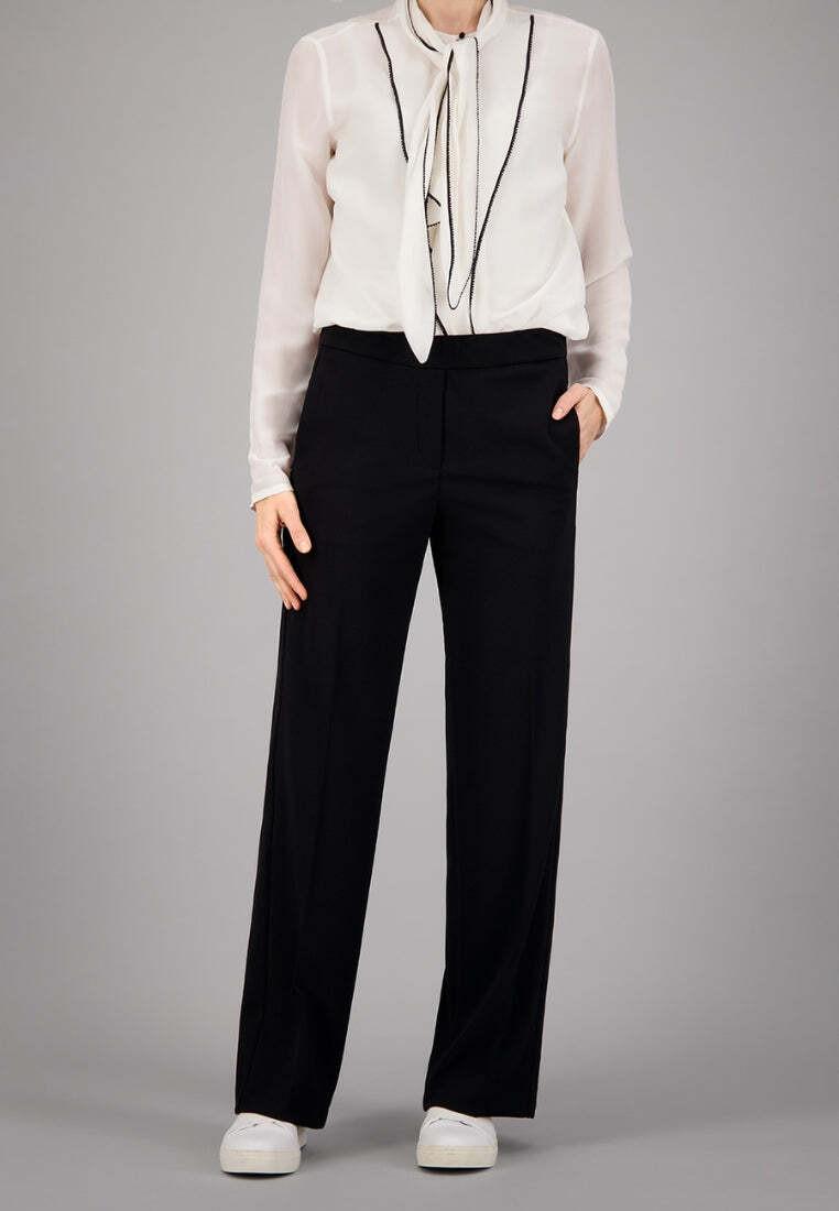 Die FRANCA800 Hose in Schwarz vereint Lässigkeit und Eleganz. Mit ihrem hohen Bund und dem Wide-Leg-Schnitt sorgt sie für eine moderne Silhouette, während der Gummizugbund optimalen Tragekomfort bietet. Bundfalten und Paspeltaschen am Gesäß runden den Look ab.
