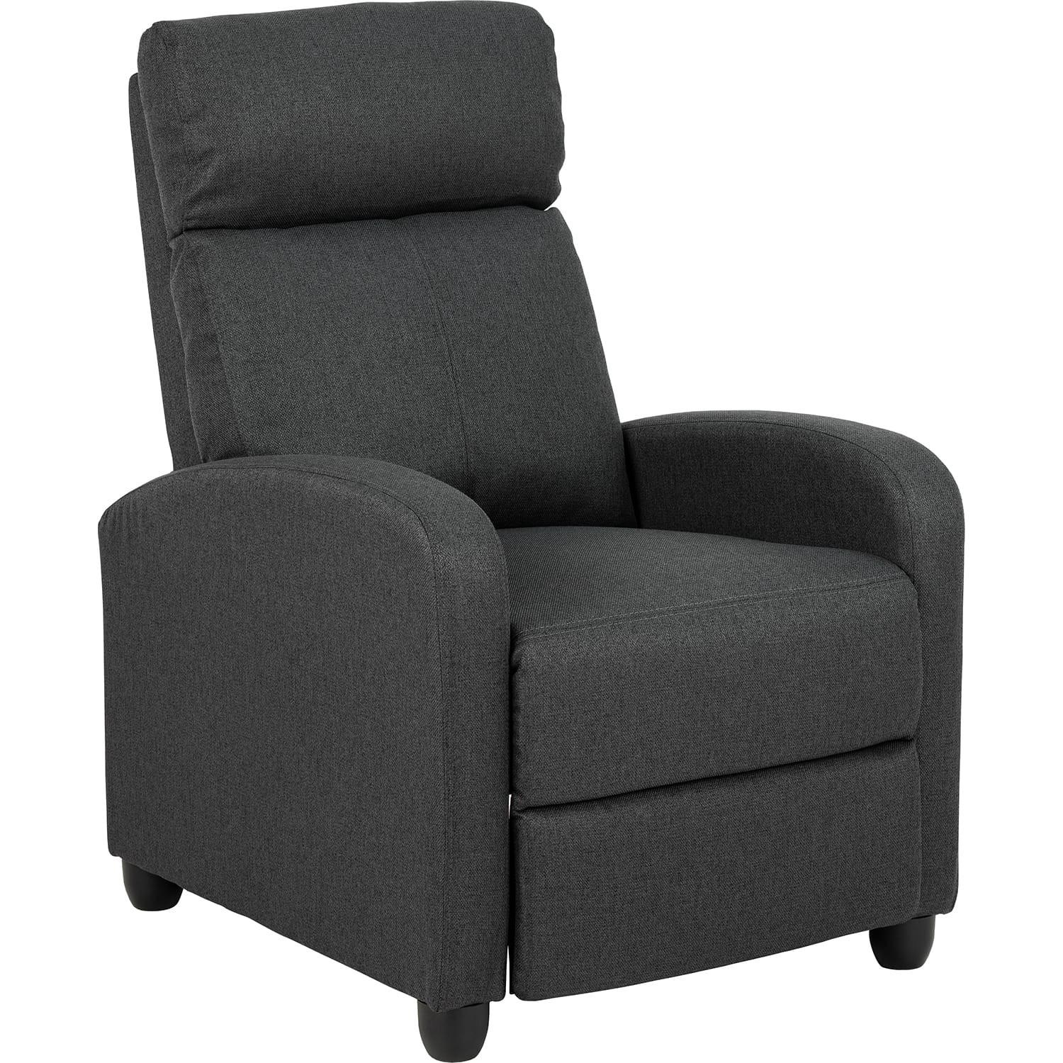 Stilvoller Liegesessel mit Schubfunktion Strapazierfähiges Flachgewebe in Anthrazitfarbe Matte, schwarze Gestell Teilmontiert für eine einfache Montage Taschenfedern für hohen Sitzkomfort Armlehnenhöhe vom Boden: 57 cm Rückenlehnenhöhe: 52 cm Maximale Belastbarkeit: 110 kg