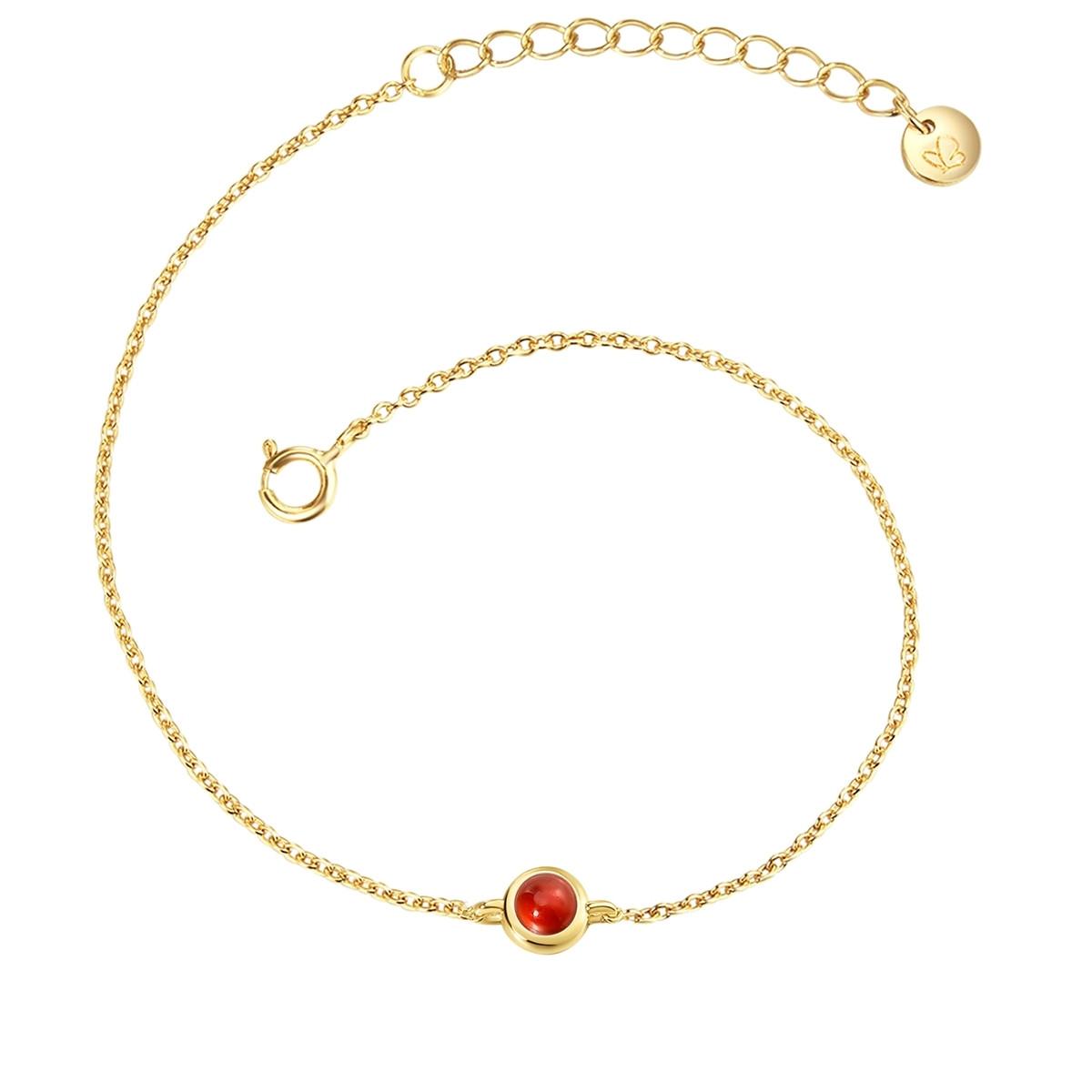 Du magst Schmuckstücke mit antiken Vibes? Dann wird dieses bezaubernde Armband des Labels Glanzstücke München dein Schmuckkästchen bereichern: Inspiriert von Accessoires des Art Déco spielt ein Edelstein im Cabochon-Schliff die Hauptrolle. Der traditionelle kuppelförmige Glattschliff verleiht dem Granat nicht nur außergewöhnlichen Glanz, sondern auch den angesagten Vintage-Look. Der Edelstein ist in ein filigranes Ankerkettchen integriert und wird mit einem komfortablen Federringverschluss geschlossen. Kettchen und Edelstein-Fassung sind aus gelbvergoldetem Sterlingsilber gefertigt und fügen sich harmonisch in das Jugendstil-Design ein.