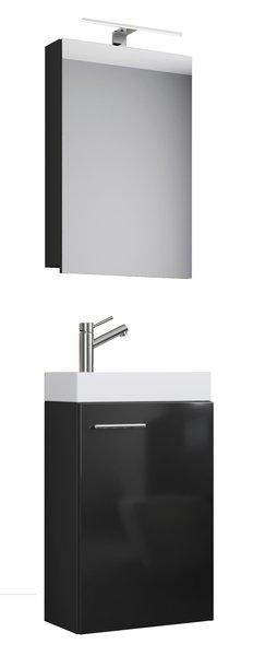 Das Set besteht aus einem Spiegelschrank und einem Waschbecken mit Waschbeckenunterschrank. Eine sehr elegante Einrichtungslösung für WCs oder Gästetoiletten, um ein optisches Highlight zu setzen.