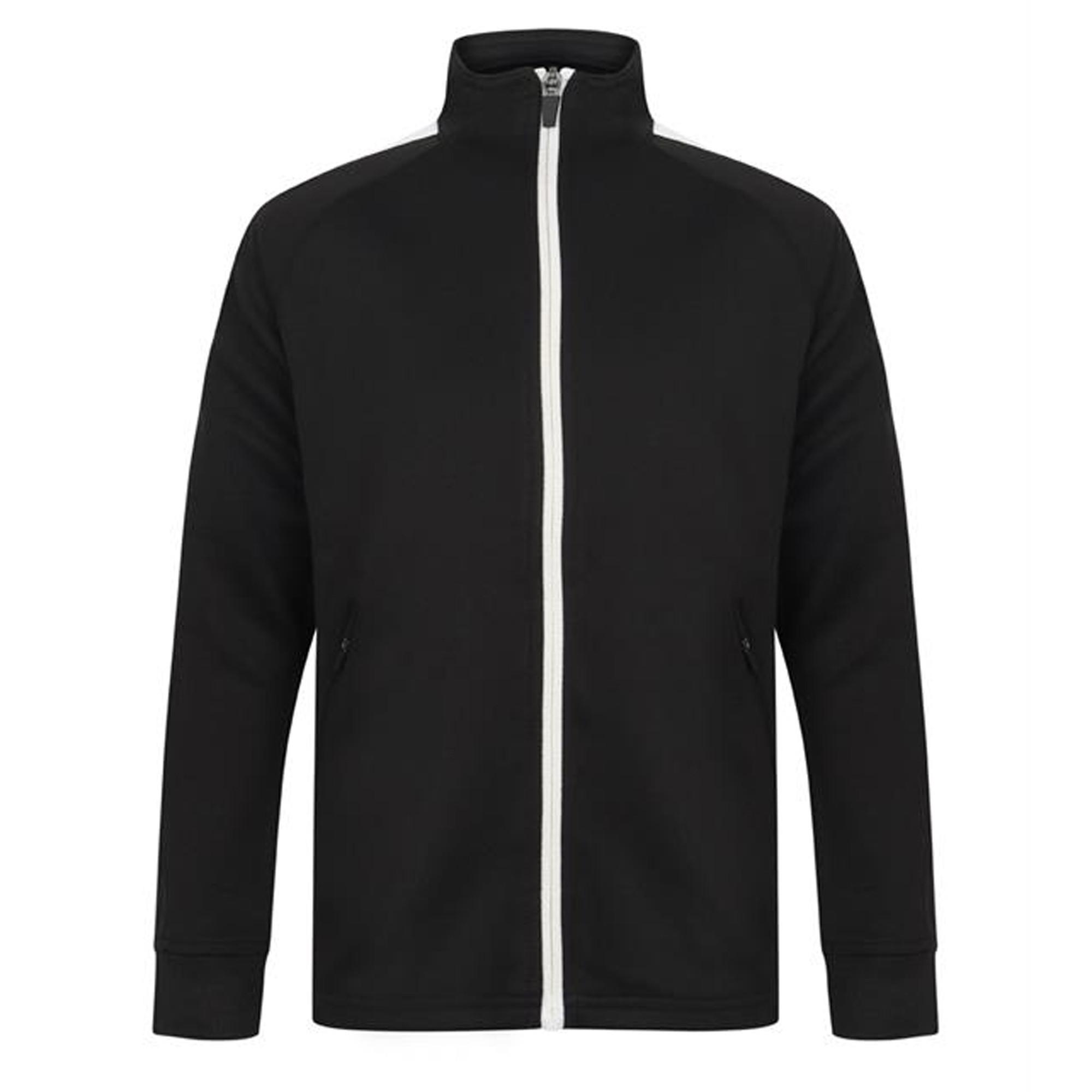 100% Polyester. GSM (Gramm pro Quadratmeter): 250. Design: Kontrasteinsatz. Verschluss: Kontrastfarbener Reißverschluss. Passform: Schmal. Kleidungsmerkmale: Abreiß-Etikett. Taschenart: 2 Reißverschlusstaschen. Halsausschnitt: Weiter Stehkragen. Ärmelart: Langärmlig. Bündchen: gerippt.