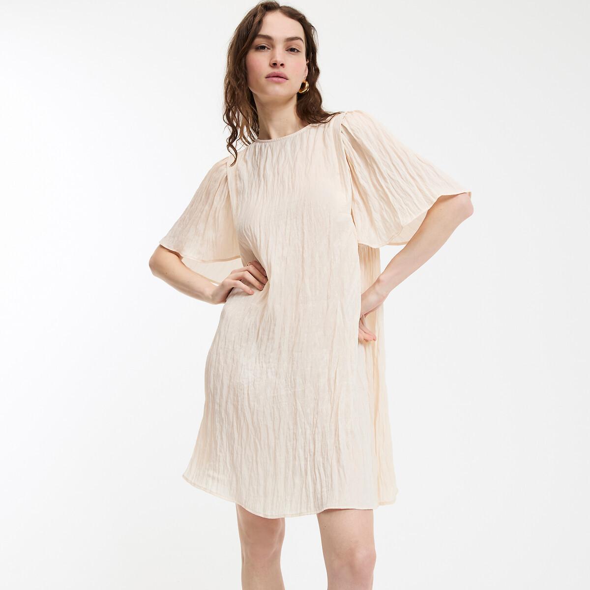 Dieses kurze, fliessende Kleid hat vorne einen Rundhalsausschnitt und hinten einen quadratischen Ausschnitt mit Bindeband. Es verfügt über kurze Schmetterlingsärmel und einen ausgestellten Schnitt, der ihm mehr Weite verleiht. Aus Crinkle-Gewebe gefertigt, lässt sich dieses Kleid gut in den Urlaub mitnehmen.