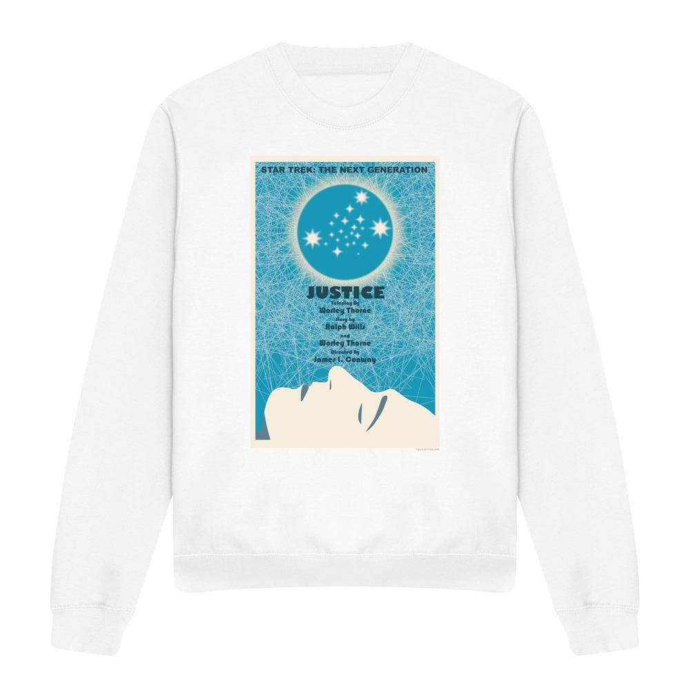 Dieses Sweatshirt zeigt einen einzigartigen Grafikdruck, inspiriert von "Star Trek: The Next Generation" Staffel 1, Episode 8, mit dem Titel "Justice". Das Design fängt die Essenz der Episode mit einer stilisierten Darstellung des Himmelskörpers und der Sterne vor einem Hintergrund aus komplexen Linien ein. Die Namen der Crew sind subtil in das Kunstwerk integriert, was es zu einem unverwechselbaren Stück für Fans macht.
