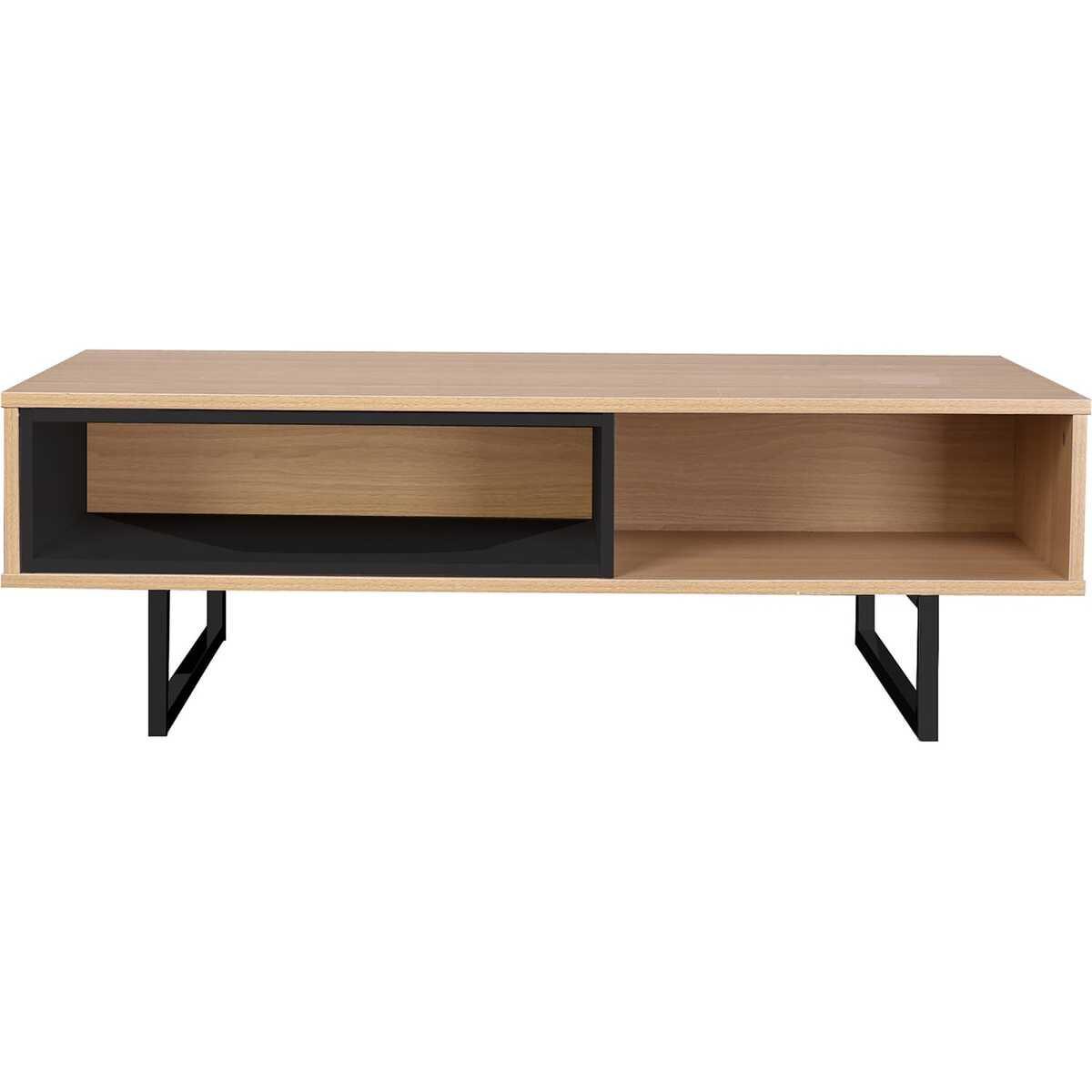 Dieses stylische Lowboard wird Sie verzaubern. Es verfügt über ein grosses, offenes Fach, welches dank Einsatz auf zwei Fächer aufgeteilt werden kann. Ganz wie Sie es wünschen und benötigen. Die Oberfläche des Möbelstücks besteht aus MDF und die Füsse aus Metall. Auf diesem TV-Tisch können Sie Ihren Fernseher platzieren. Die offenen Fächer können als Stauraum für Fernbedienung oder Zeitschriften genutzt werden oder Sie stellen ein wenig Deko dort ab. Das Lowboard sieht nicht nur schick aus, es erfüllt eben auch seinen Zweck.modernes Kufengestellgradliniges Designmit Stauraum für Zeitschriften und Fernbedienungmit Eiche-DekorMetall-Gestell sorgt für festen Stand