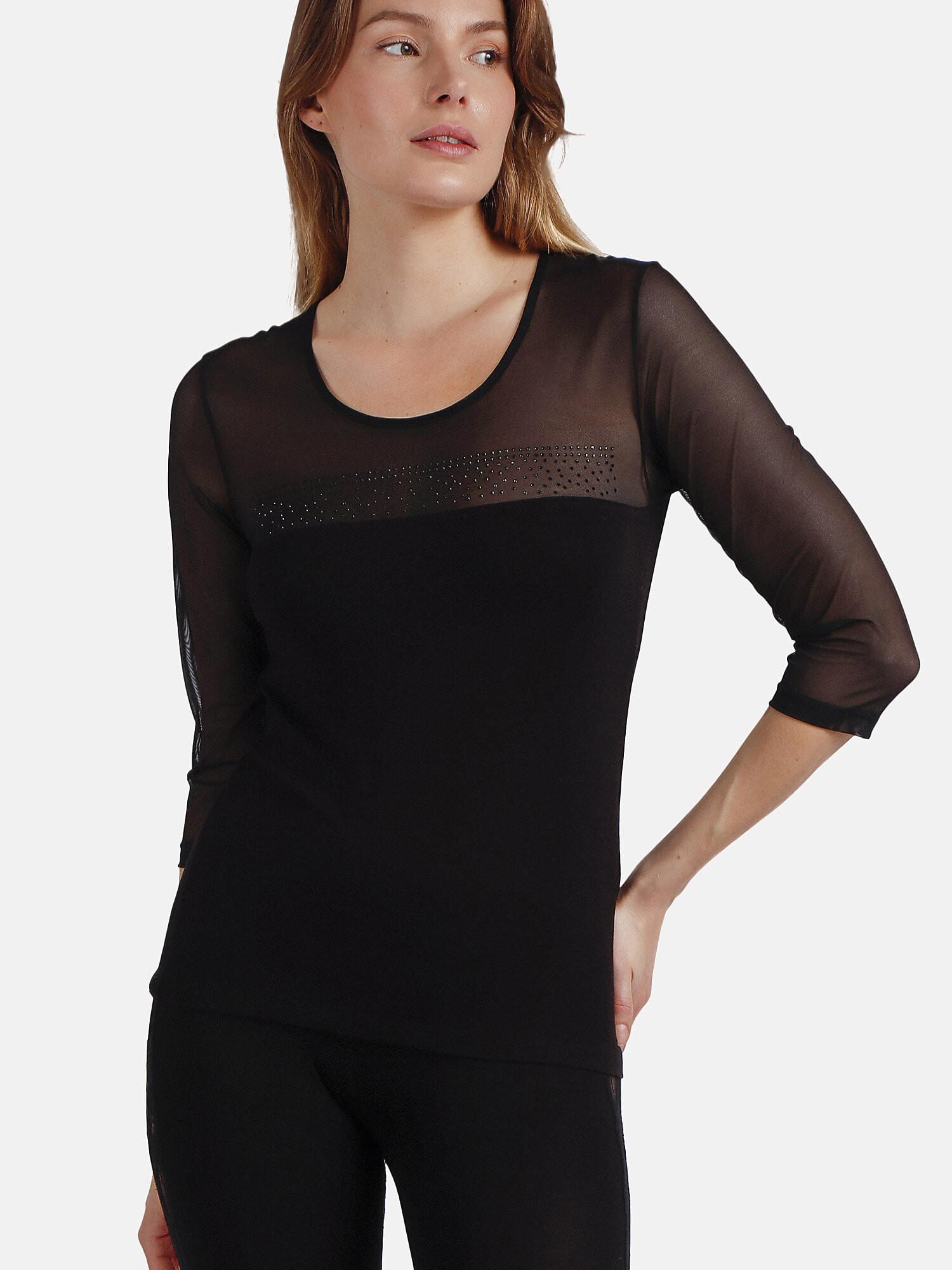 Dieses elegante T-Shirt präsentiert sich in einem raffinierten Design mit halblangen Ärmeln und einem Rundhalsausschnitt. Der obere Brustbereich und die Ärmel sind aus einem transparenten Mesh-Gewebe gefertigt, das einen Hauch von Verführung verleiht. Eine zarte Verzierung aus kleinen, funkelnden Steinen schmückt den Brustbereich und unterstreicht die raffinierte Ausstrahlung.