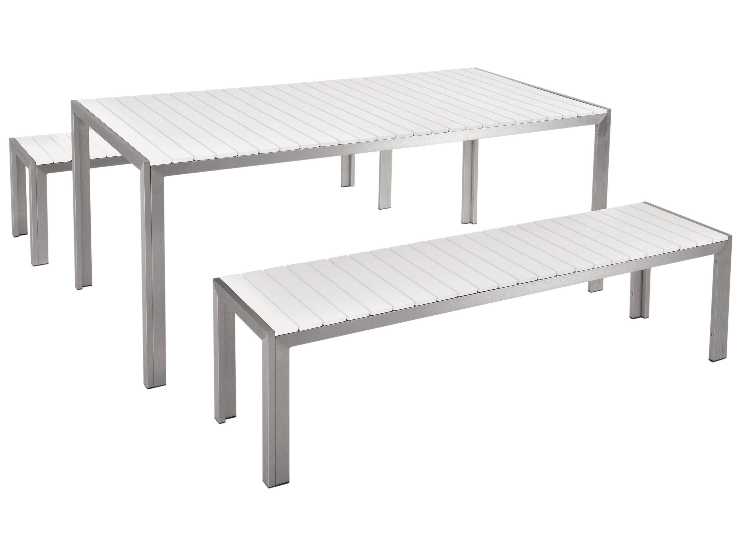 Edle Kunstholz Sitzgruppe in Weiss. Für diese Möbel Reihe wurde ausschliesslich qualitativ hochwertigstes Kunstholz benutzt. Das verwendete Aluminium wird nach den neuesten Verfahren raffiniert und hochwertig veredelt. Sowohl Kunstholz, wie auch Aluminium lassen sich vollständig recyclen und sind umweltschonend produziert. Zusätzlich zum Tisch erwerben Sie ebenfalls 2 passende Gartenbänke, welche sich ebenfalls hervorragend einzeln im Garten, auf der Terrasse oder auch auf dem Balkon aufstellen lassen. Das Gartentischset ist überaus gut kombinierbar mit anderen Gartenmöbeln oder Accessoires.