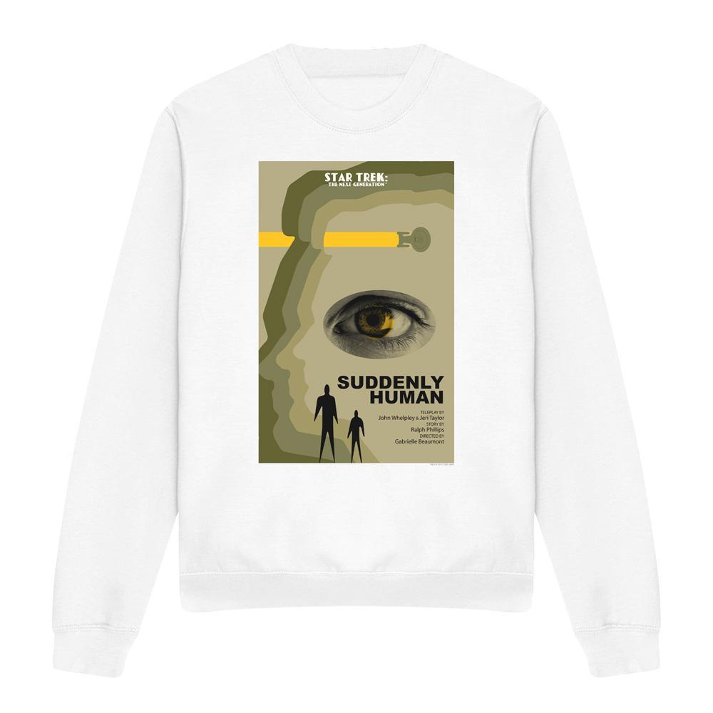 Dieses Sweatshirt zeigt einen einzigartigen Grafikdruck, inspiriert von "Star Trek: The Next Generation" Staffel 4 Episode 4, "Suddenly Human". Das Design präsentiert ein stilisiertes menschliches Profil mit einem markanten Auge, vor einem Hintergrund aus Erdtönen und einem leuchtend gelben Streifen, der an das ikonische Starfleet-Abzeichen erinnert. Es besteht aus einer bequemen Mischung aus Baumwolle und Polyester und bietet eine reguläre Passform und lange Ärmel.