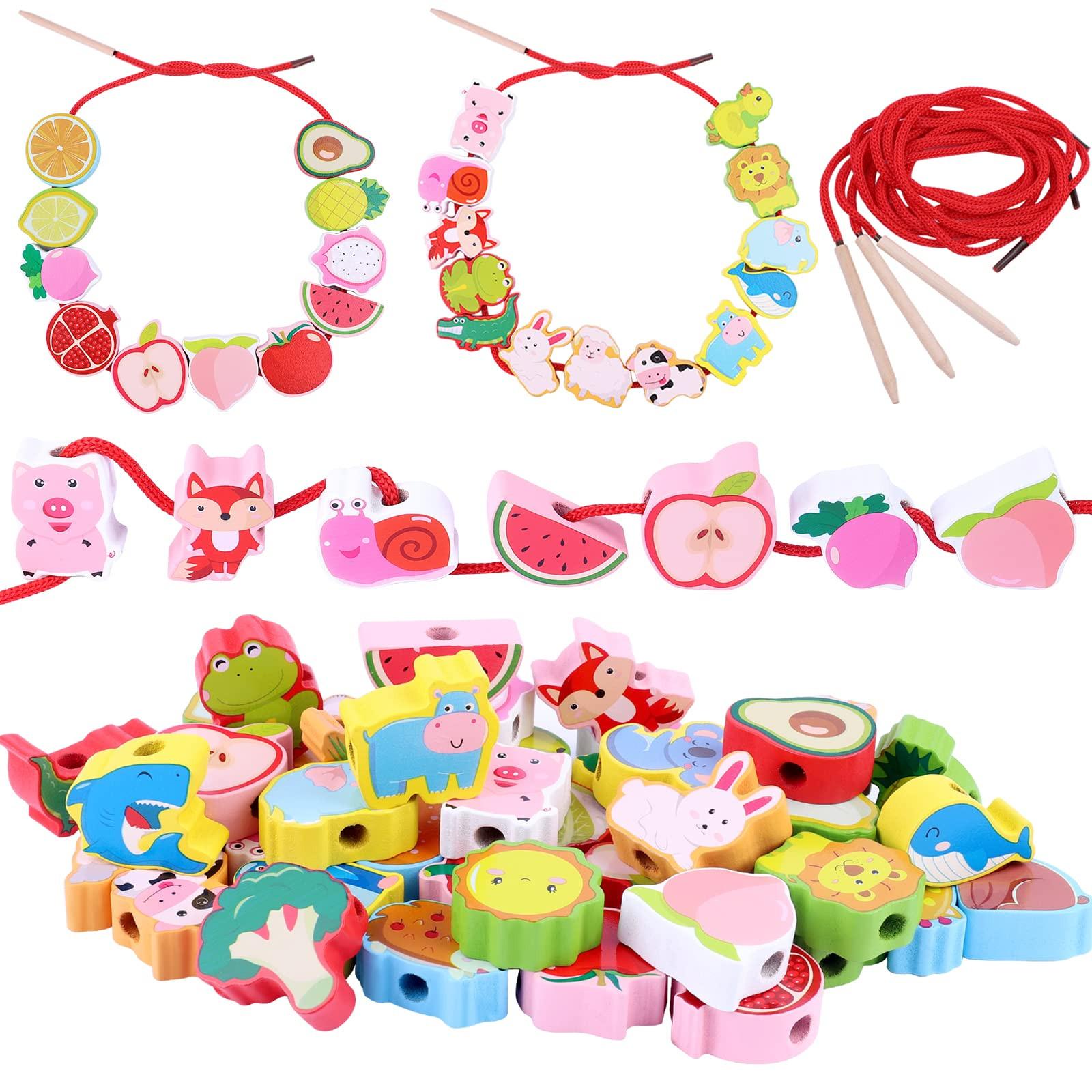 Activity-board 44 Stück Holzspielzeug Motorikspielzeug Tier Gemüse Obst Holzperlen Fädeln Lernspielzeug