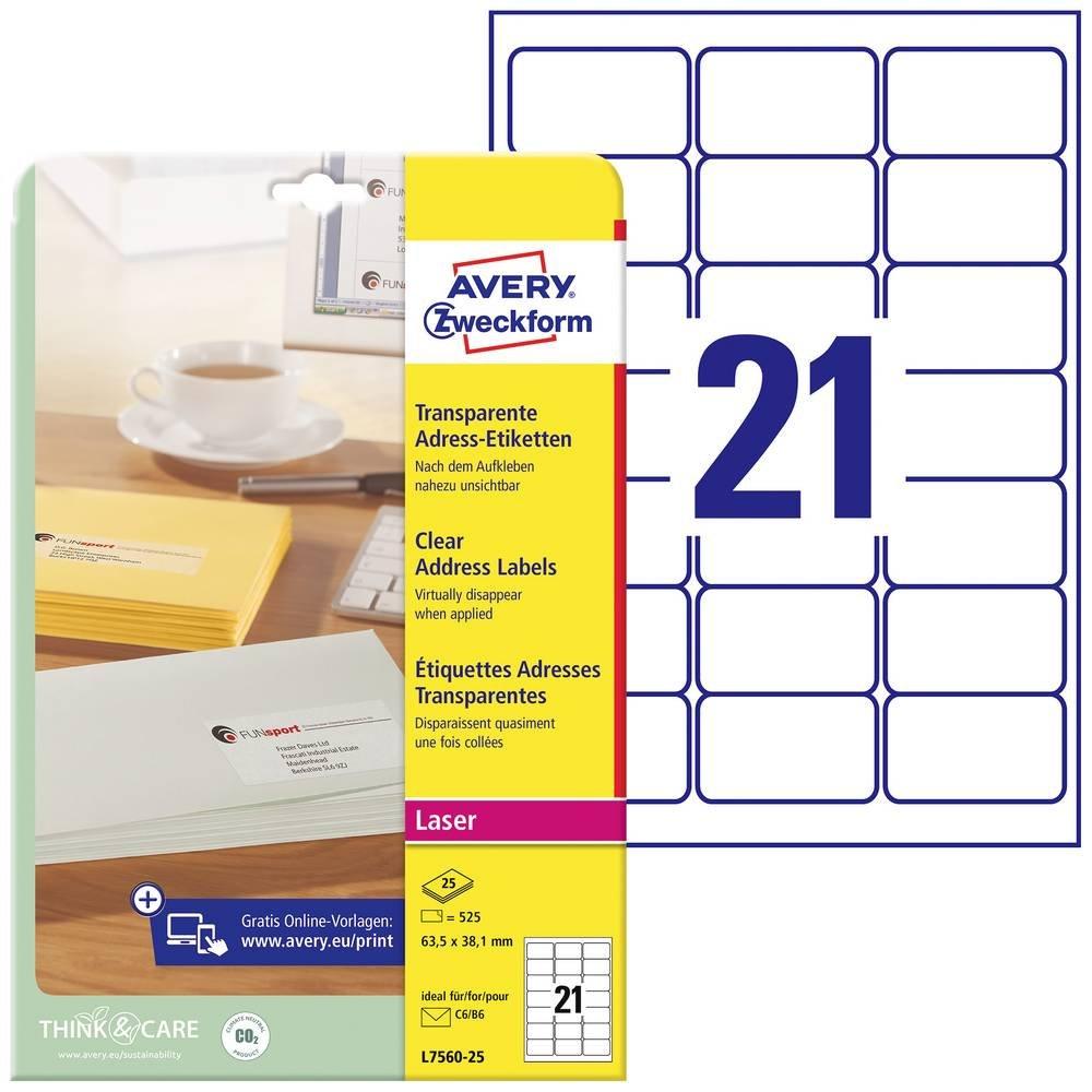 Die transparenten Adress-Etiketten L7560-25 im Format 63,5 x 38,1 mm für Laser-Drucker von AVERY ZWECKFORM eignen sich z.B. für C6 Kuverts oder für die INTERNETMARKE der Deutschen Post. 525 Etiketten pro Packung auf 25 Bogen. Die Adress-Etiketten sind optimal auf alle gängigen Kuvertgrössen abgestimmt. Die transparenten Folien-Aufkleber aus Polyester sind nach dem Aufkleben nahezu unsichtbar, die Adresse wirkt dadurch wie auf das Kuvert gedruckt - optimal für helle Kuverts. Sie können sich auf einen absolut staufreien Druckerdurchlauf ohne Klebstoffablagerungen im Drucker verlassen. Gestalten und drucken Sie Ihre Adressaufkleber schnell und einfach - mit den kostenlosen Avery Zweckform Etiketten-Vorlagen und Software-Lösungen oder den im Microsoft® Office Paket integrierten Basis-Vorlagen. Einfaches Abziehen und Aufkleben mit der einzigartigen QuickPEEL-Abziehhilfe. Geeignet für alle gängigen Laser-Drucker. Das klimaneutrale Unternehmen Avery Zweckform verwendet schon seit 2014 ausschliesslich Ökostrom/-gas. Forschung, Entwicklung, Produktion, Logistik und Verwaltung am Firmenstandort in Oberlaindern/Bayern garantieren höchste Qualitätsstandards, hohe Umweltvorgaben und kurze Lieferwege. Die Etiketten aus PVC-freier Folie werden CO2 neutral hergestellt, die Emissionen des Materials werden kompensiert.