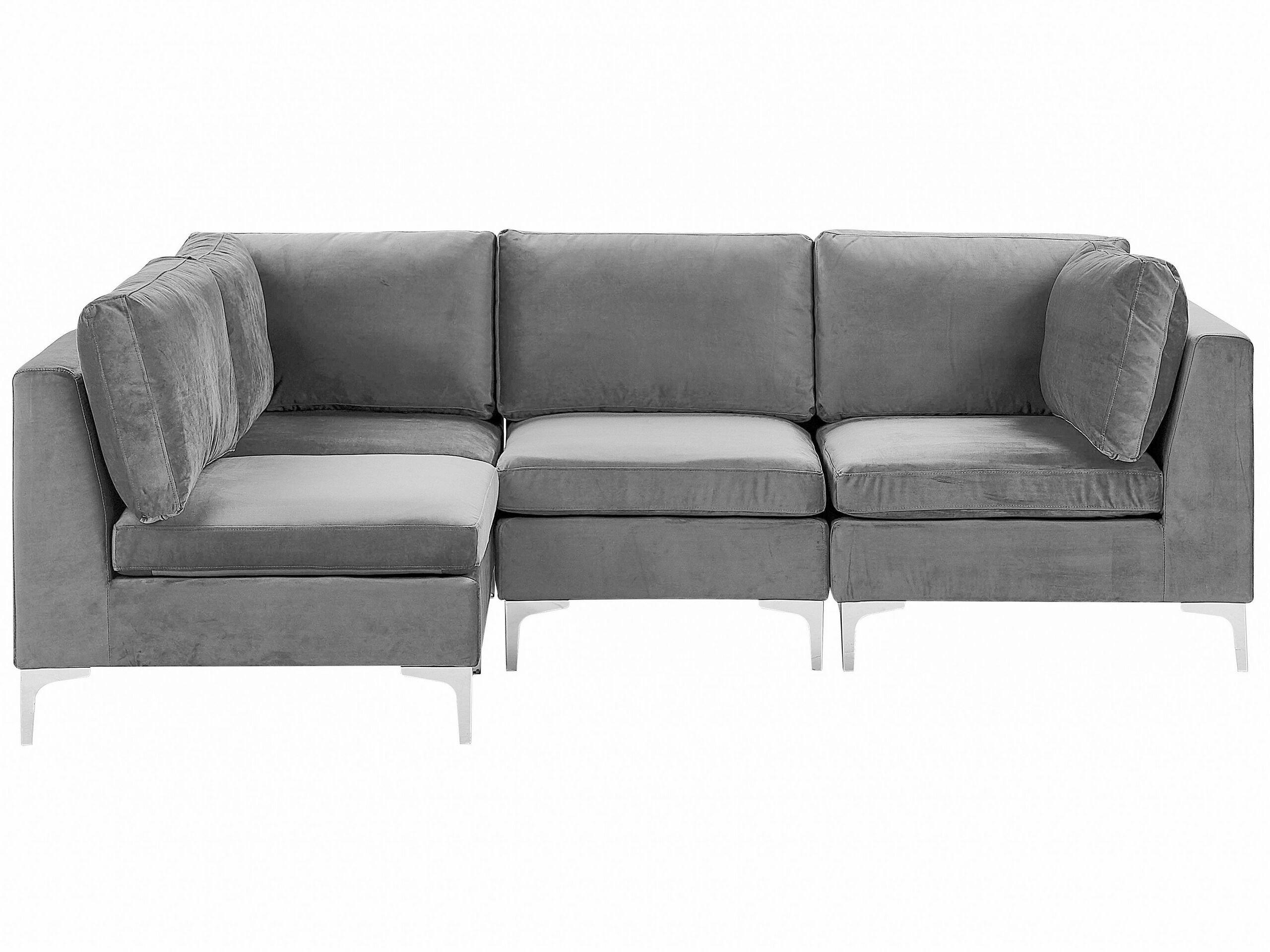 Klassisches, rechtsseitiges Ecksofa im trendigen Grau für bis zu 4 Personen. Das Sofa besitzt einen hochwertigen Rundumbezug aus Samtstoff, sowie abnehmbare Kissenbezüge, weshalb es auch für Familien mit Kleinkindern oder Tierliebhaber eine gute Wahl sein kann. Die trendige Farbgebung in Grau korrespondiert ausgezeichnet mit den verchromten Metallbeinen in Silberoptik, weshalb es äusserst modern, edel und einladend wirkt. Die Eckteile und die Sessel kann man miteinander verbinden, um ein langes Ecksofa zu erschaffen oder sie als selbstständige Möbelstücke zu nutzen.