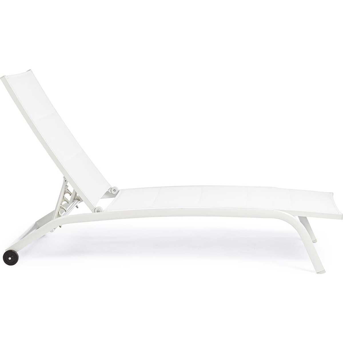 Rollenliege Cleopas weiss. Gestell aus Aluminium, pulverbeschichtet (Polyester). Bezug 2x1 Textilene (mit Polsterung). 5-fach verstellbare Rückenlehne. Kunststoffrollen.