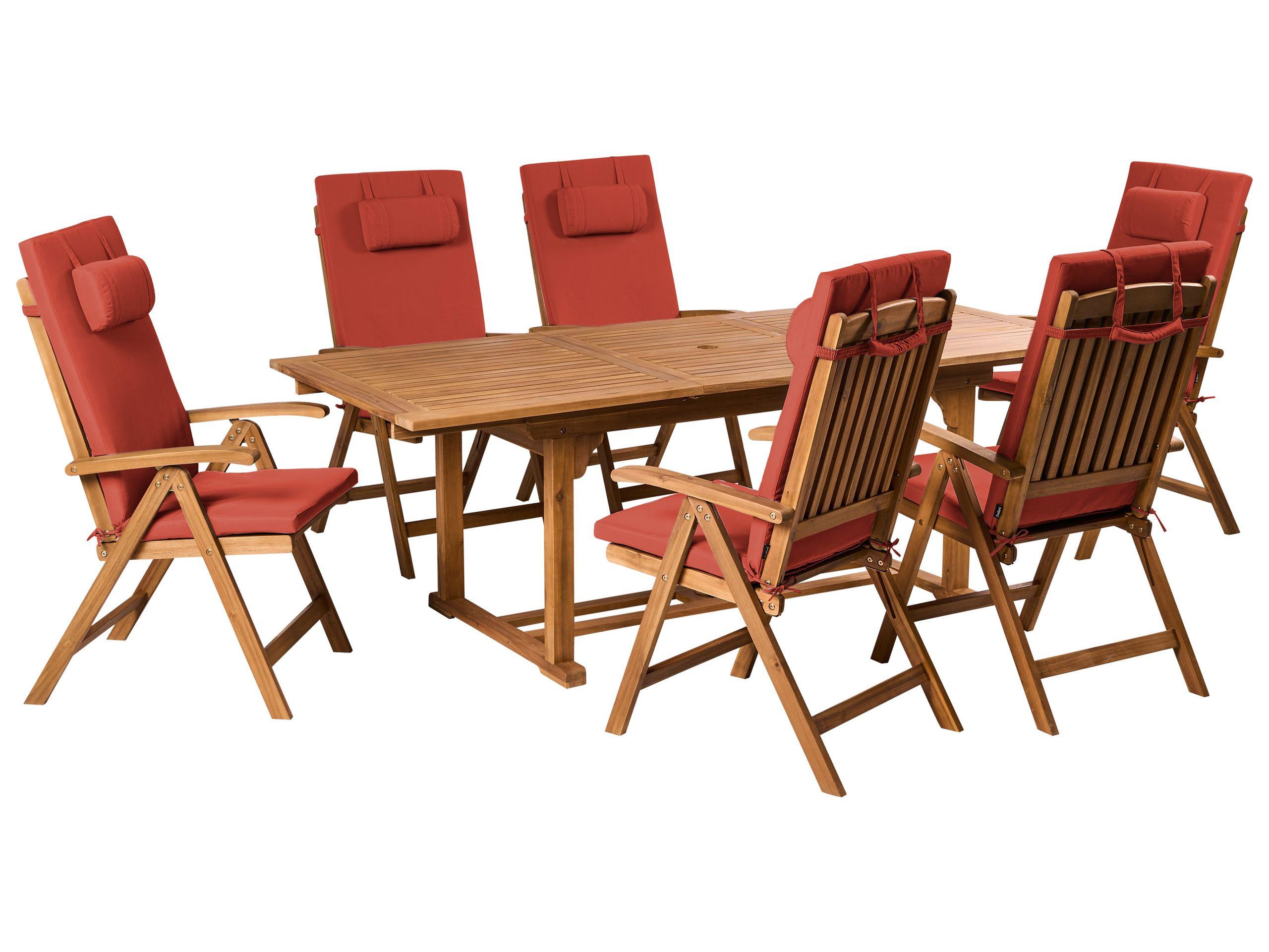 Stilvolles Gartenmöbel Set mit bequemen Sitzpolstern und Platz für bis zu 6 Personen. Das wunderschöne Gartenset besteht aus einem rechteckigen Gartentisch, 6 bequemen Gartenstühlen mit Armlehnen und passenden Auflagen. Der praktische Gartentisch lässt sich mit einer integrierten Butterflytechnik ausziehen. Die Verlängerungsplatten sind in der Tischtechnik integriert und sind mit einer Öffnung für einen Sonnenschirm versehen. Im Sockel befindet sich eine Stabilitätsvorrichtung für den Schirm. Selbstverständlich lassen sich die Stühle platzsparend zusammenklappen. Das edle Akazienholz mit seiner wunderschönen, warmen Farbe ist witterungsbeständig und pflegeleicht. Jede der Auflagen besteht aus 2 Segmenten, die sich der Körperhaltung perfekt anpassen und ist aus einem strapazierfähigen, feuchtigkeits- und UV-beständigen Stoff gefertigt, der mit einer dicken Schaumstofffüllung ergänzt ist.