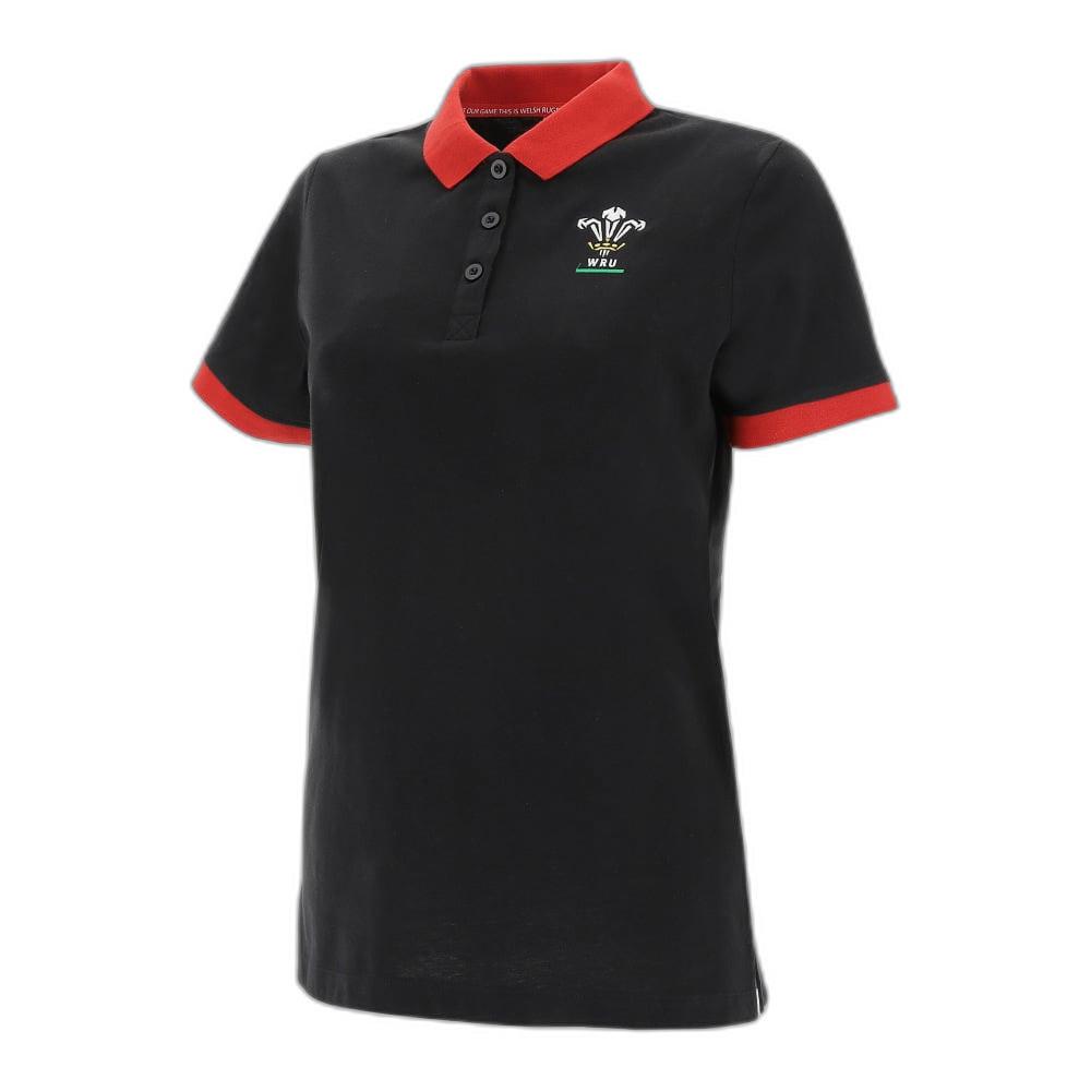 Dieses Kurzarm-Poloshirt gehört zur Fanlinie der walisischen Rugby Union 2020/21 für Damen. Es ist aus weichem Baumwoll-Jersey gefertigt, in Schwarz mit roten Details an Kragen und Ärmeln. Das Poloshirt verfügt über einen Knopfkragen und ein gesticktes Vereins-Patch mit einem personalisierten Stoffetikett auf der Rückseite des Kragens.