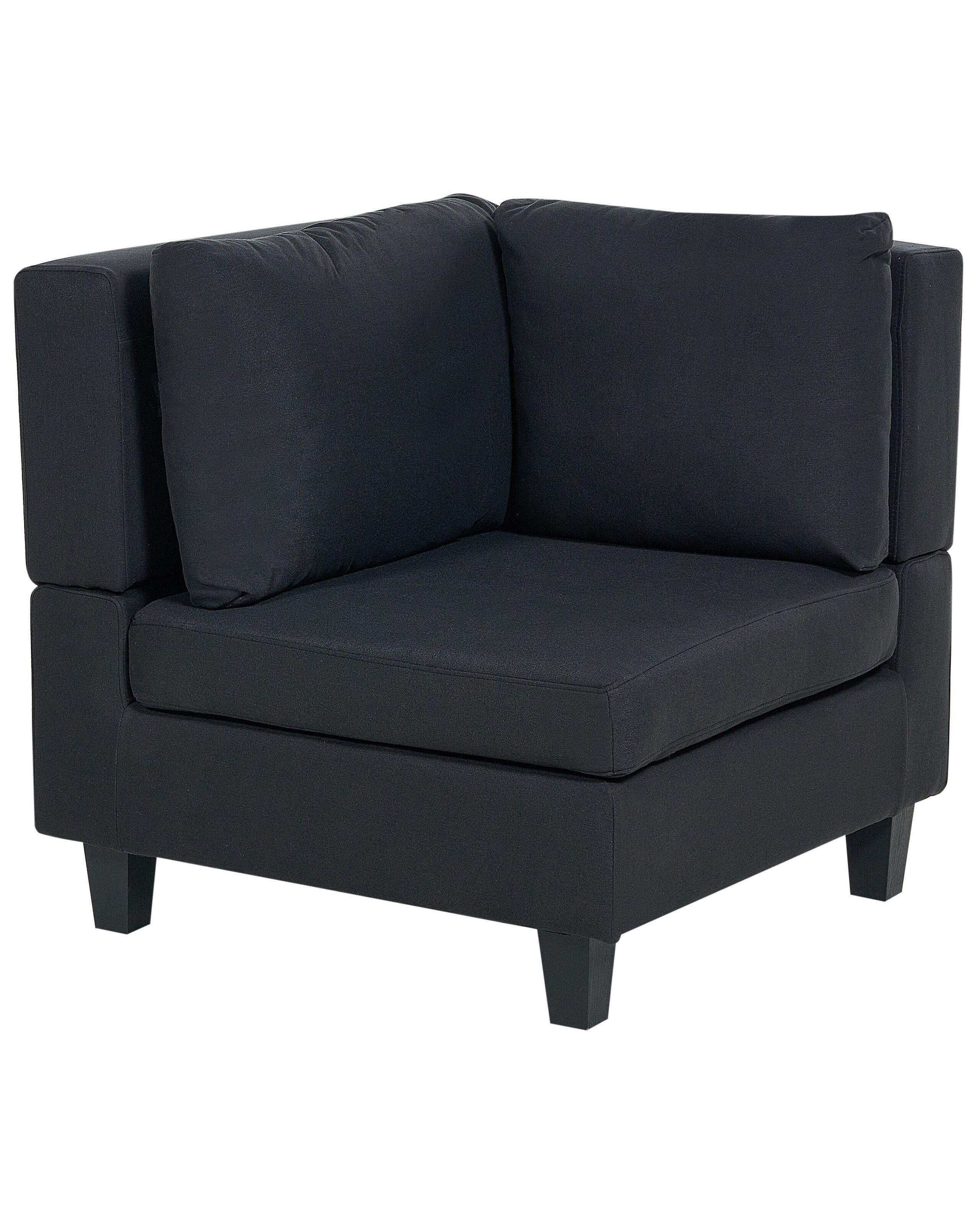 Modernes Eckmodul mit schwarzem Stoffbezug und passenden Beinen. Dieses multifunktionale Eckmodul kann sich als eigenständiges Möbelstück in jedem Wohnbereich bewähren. In Kombination mit den anderen Modulen dieser Serie können Sie ein langes Sofa oder eine U-förmige Wohnlandschaft kreieren, da man die Sitzplätze mittels verdeckter Steckverbinder einfach und komfortabel miteinander verbinden kann. Der weiche Stoffbezug in edler Leinenoptik sorgt für ein herrliches Sitzgefühl, so dass Sie jede freie Minute mit Vergnügen auf dem Sessel verbringen werden. Zusätzliche Eleganz und Stabilität versprechen die dicken Kunststoffbeine.