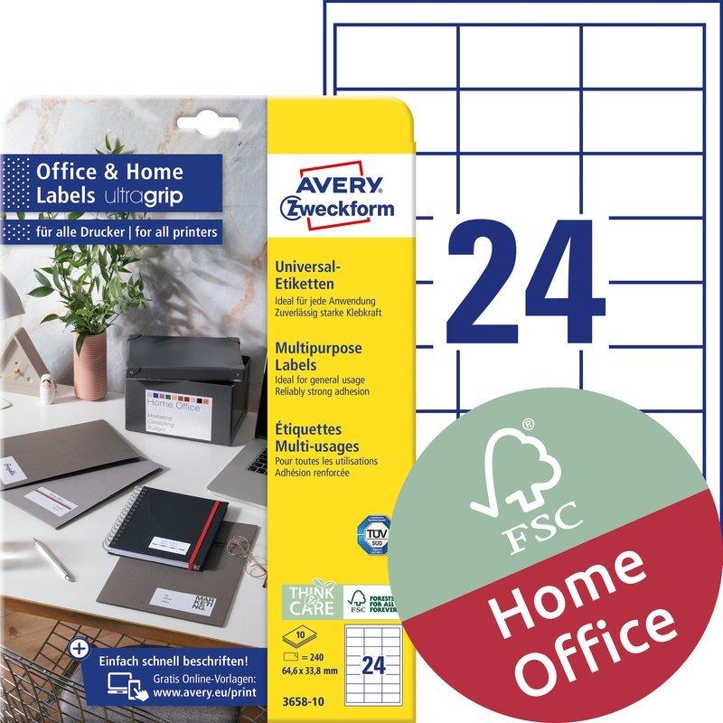 Die weissen, permanent haftenden Universal-Etiketten 3658-10 im Format 64,4 x 33,8 mm von AVERY ZWECKFORM eignen sich z.B. zur Eigentumskennzeichnung und als Adressaufkleber (240 Etiketten/Pack). Die 10-Blatt-Kleinpackung ist perfekt geeignet für den Bedarf im Home Office. Dank der innovativen ultragrip-Technologie können Sie sich auf einen ultrapräzisen Druckereinzug und absolut staufreien Druckerdurchlauf verlassen. Die QCT-Sicherheitskante verhindert Klebstoffablagerungen im Drucker. Die Etiketten sind für alle gängigen Laser- und Inkjet-Drucker geeignet. Der problemlose Etikettendruck auf Laser-Druckern wurde sogar vom TÜV SÜD getestet und bestätigt. Die Aufkleber kleben zuverlässig auf Papier, Karton, Glas und Kunststoffen und überzeugen mit einem klaren Druckbild ohne Verwischen.Gestalten und drucken Sie Ihre Aufkleber schnell und einfach mit den Avery Zweckform gratis Vorlagen im Design&Print Online Designer oder den im Microsoft® Office Paket integrierten Basis-Vorlagen. Schnelle und effiziente Anwendung dank QuickPEEL-Abziehhilfe.Das klimaneutrale Unternehmen Avery Zweckform verwendet schon seit 2014 ausschliesslich Ökostrom/-gas. Forschung, Entwicklung, Produktion, Logistik und Verwaltung am Firmenstandort in Oberlaindern/Bayern garantieren höchste Qualitätsstandards, hohe Umweltvorgaben und kurze Lieferwege. Das Obermaterial dieser chlorfrei gebleichten Etiketten wird zu 100% aus FSC®-zertifiziertem Papier aus nachhaltig bewirtschafteten Wäldern hergestellt.