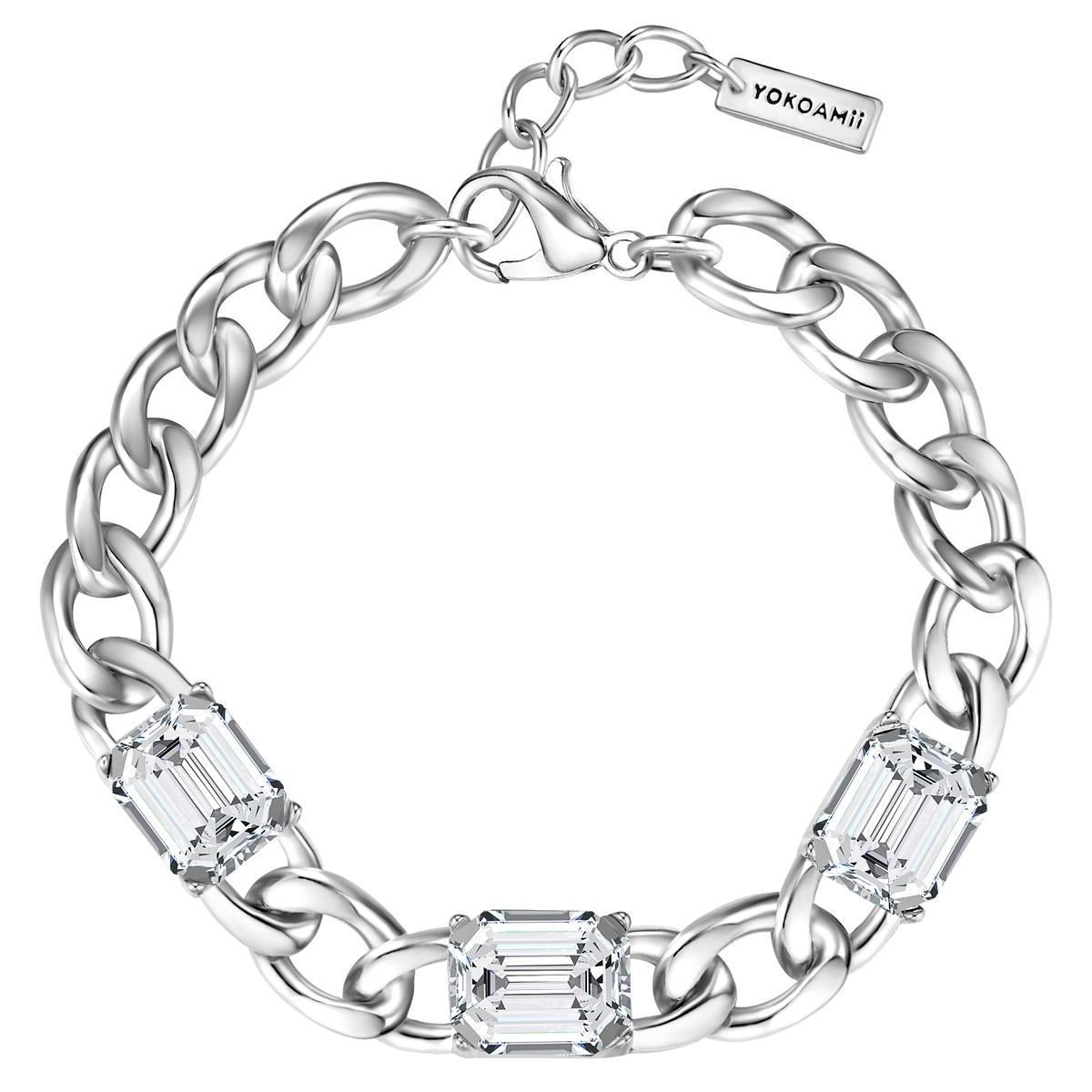 Du suchst ein extravagantes, aber erschwingliches Schmuckstück? Dieses Armband des jungen Trendlabels YOKOAMii begeistert alle Schmuckliebhaberinnen mit seinem modernen Materialmix und einer trendigen Formensprache. Ein grobgliedriges Panzerarmband windet sich um dein Handgelenk, verziert mit großen, kubusförmig facettierten Glas-Kristallen - eine spannende Verbindung zwischen markantem "edgy" Design und einem Hauch Glamour. Das Ergebnis ist ein Accessoire, das zu lässigen Jeans ebenso gut passt wie zu festlichen Outfits. Das Armband ist aus Messing in Silberoptik gefertigt und lässt sich dank Karabinerverschluss mit Verlängerungskettchen perfekt an dein Handgelenk anpassen.