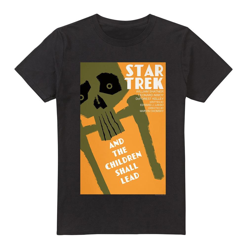 Dieses T-Shirt zeigt einen Grafikdruck, der von Star Trek: The Original Series, genauer gesagt Episode 59, "And the Children Shall Lead", inspiriert ist. Das Design präsentiert einen stilisierten Totenkopf und Text, der die Essenz der klassischen Science-Fiction-Show einfängt.