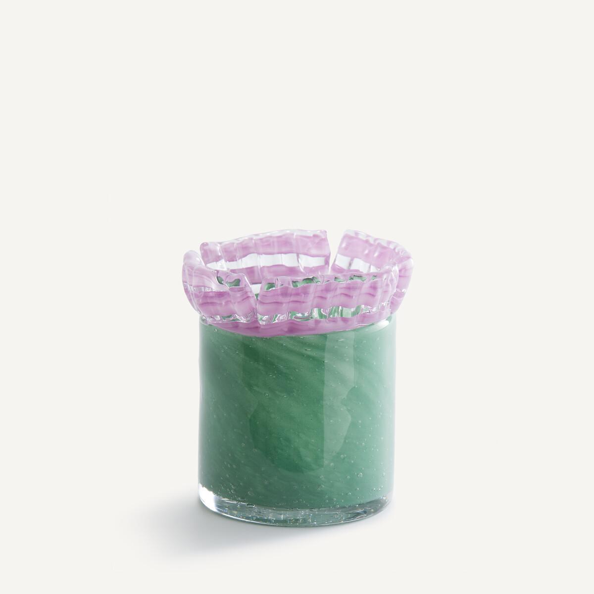 Eine schlichte zylindrische Form, die durch einen Hauch poetischer Phantasie erweckt wird. Wie von einer gerafften Borte betont, wird diese mundgeblasene Vase von einem Glashals gekrönt, der handwerklich mit dem Meissel geschnitten wurde.