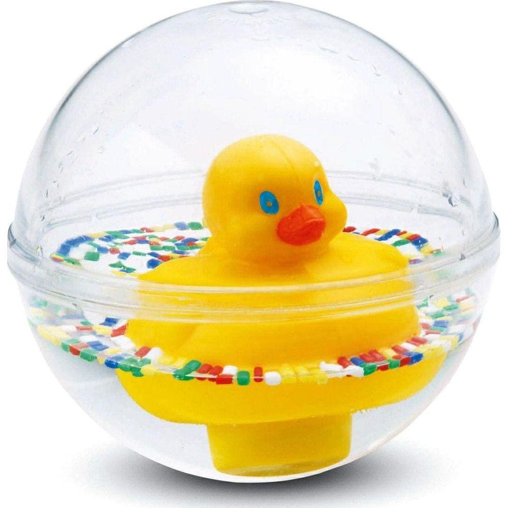 Eine fröhliche gelbe Ente schwimmt in einer transparenten Kunststoffkugel. Dieses Spielzeug fördert die motorischen Fähigkeiten von Babys und Kleinkindern ideal. Durch das Anstupsen und Rollen wird die Feinmotorik trainiert, während grössere Kinder dazu animiert werden, der Kugel hinterherzukrabbeln. Das Konfetti im Inneren sorgt für zusätzliche visuelle Anreize und spannende Spielmöglichkeiten.