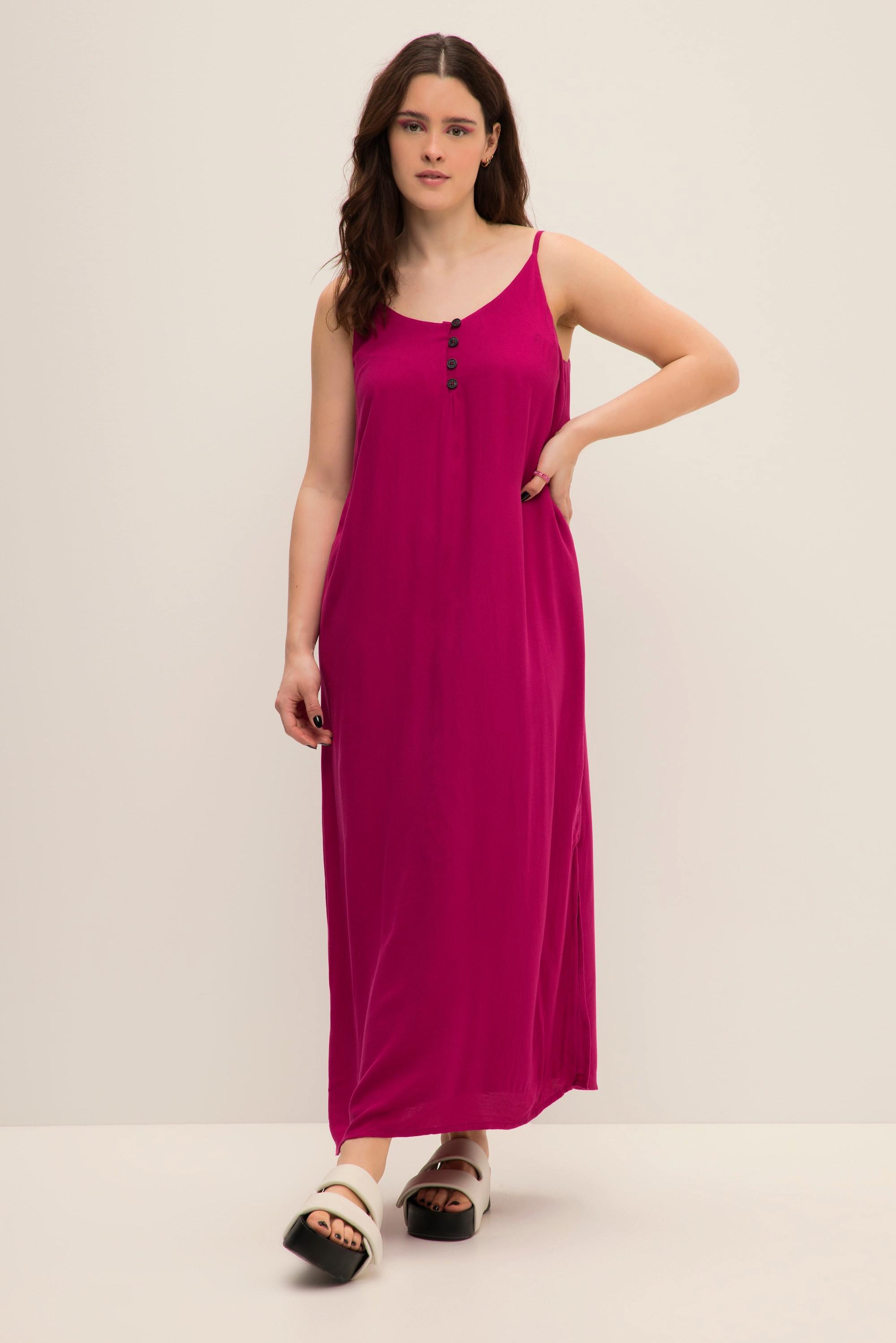 Dieses Maxikleid präsentiert sich mit einer A-Linien-Silhouette, einem V-Ausschnitt und zarten Spaghettiträgern, was eine bequeme und stilvolle Option für verschiedene Anlässe bietet. Das Design umfasst ein Knopfdetail an der Vorderseite, das einen subtilen Hauch von Eleganz verleiht.