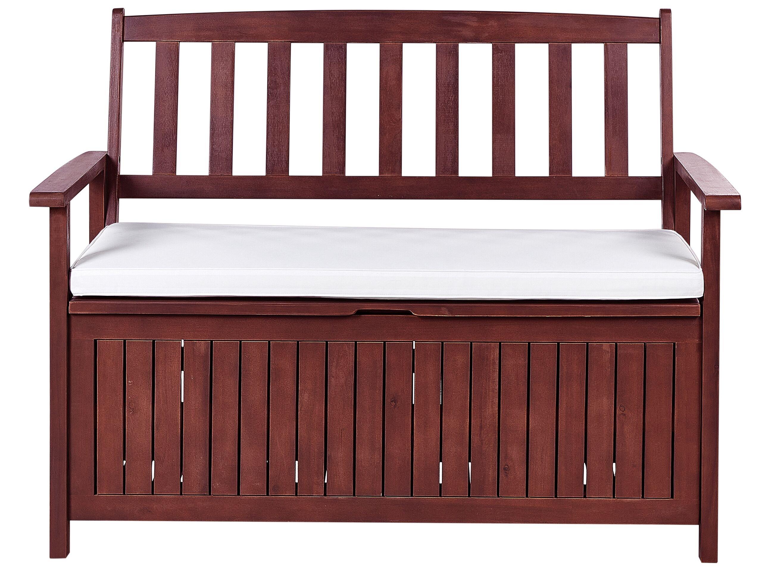 Moderne Outdoor-Sitzbank aus hochwertigem Akazienholz mit praktischer Aufbewahrungsbox und Auflage. Mit dieser geräumigen Gartenbank aus widerstandsfähigem Akazienholz bieten wir Ihnen gleichzeitig eine bequeme Sitzmöglichkeit und Stauraum. Blitzschnell verschwinden Sitzkissen, Gartengeräte oder andere Dinge unter der leicht aufklappbaren Sitzfläche. Um den Sitzkomfort der Bank zu erhöhen, ist sie mit einem zusätzlichem Sitzkissen ausgestattet. Dank den praktischen Befestigungsbändern kann die Auflage nicht verrutschen und trotzt so jedem sommerlichen Windhauch.