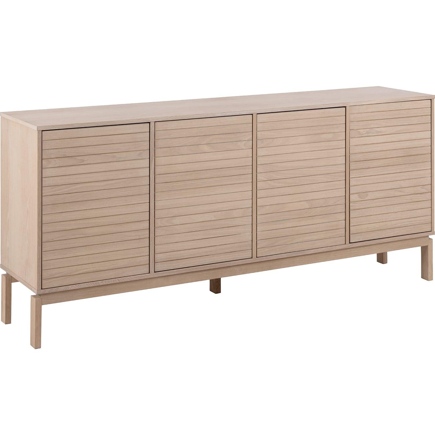 Hergestellt aus weiss pigmentiertem, geöltem Eichenholz und Furnier Attraktive Lamellenfronten an vier Türen Praktische Push-to-Open-Funktion für mühelosen Zugang Vier Regale bieten reichlich Stauraum Maximale Belastbarkeit von 25 kg für Ihre Aufbewahrungsbedürfnisse Eine natürliche Eleganz, die sich in jede Wohnlandschaft einfügt Verleiht jedem Raum eine luftige Weite ohne zu überwältigen