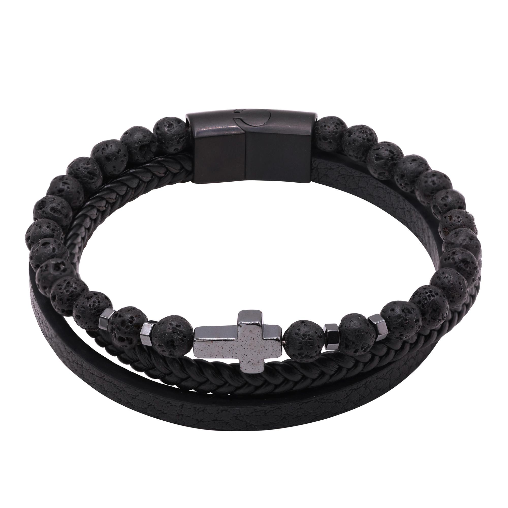 Männer Lederarmband mit Lava-Steinen und Kreuzelement