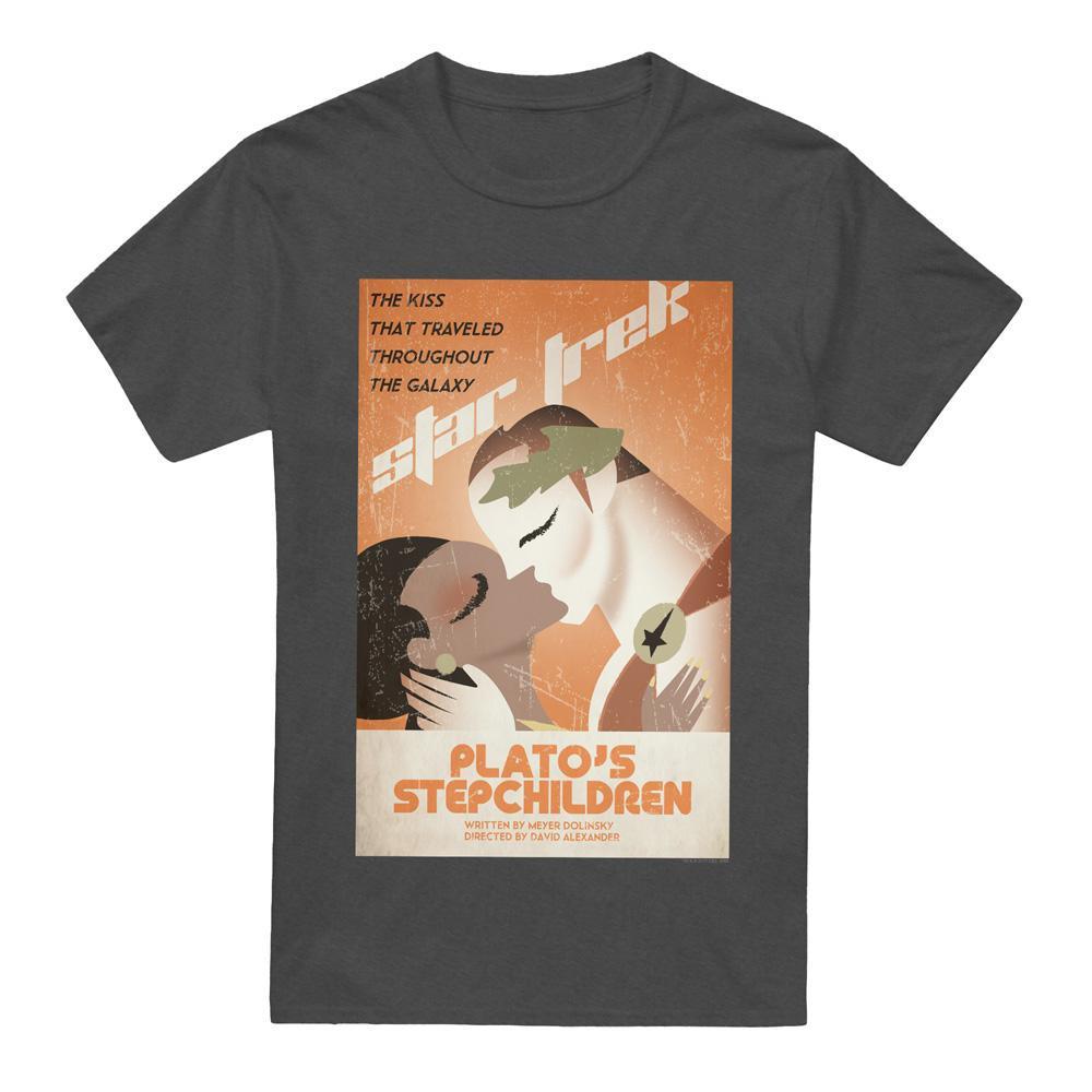 Dieses T-Shirt zeigt einen grafischen Druck, inspiriert von "Plato's Stiefkinder", Episode 65 von Star Trek: The Original Series. Das Design fängt den ikonischen Moment des "Kusses, der durch die Galaxie reiste" ein und macht es zu einem unverwechselbaren Stück für Fans.